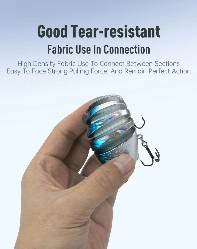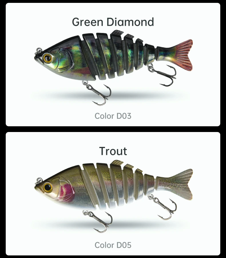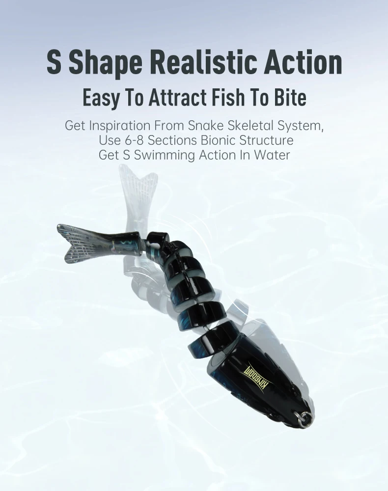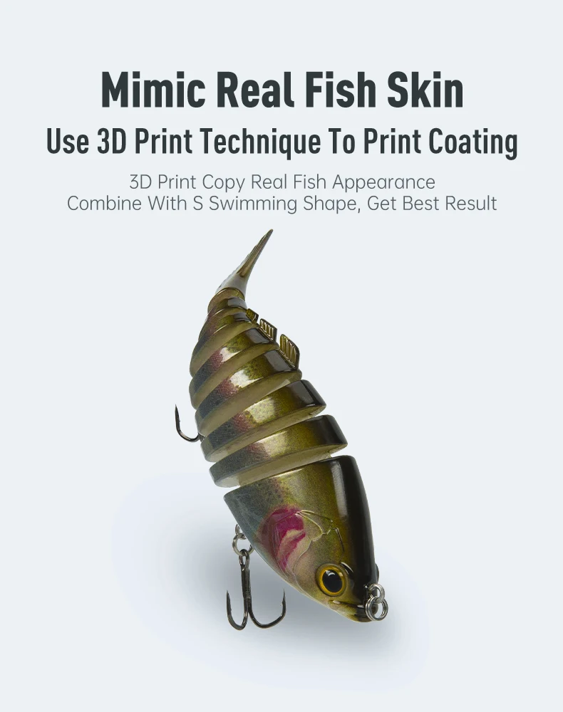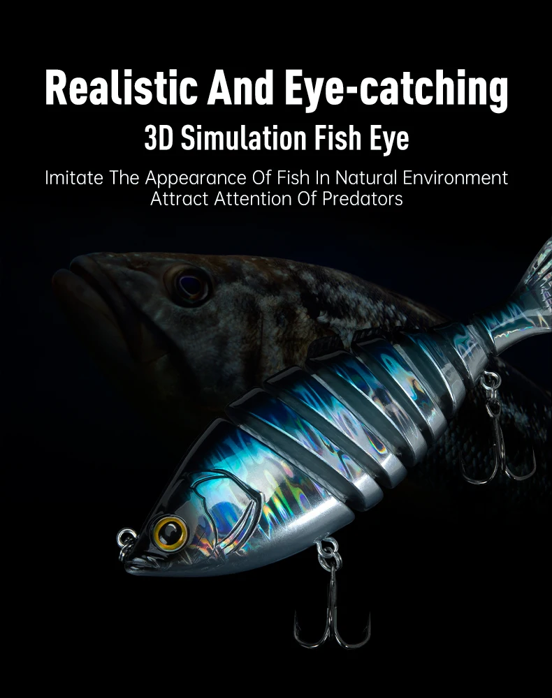 2. Diseño realista: los señuelos para lubinas tienen un cuerpo multiarticulado de 6 y 8 segmentos que imita el movimiento real de los peces bajo el agua. Los cebos para peces se hunden lentamente y se mueven con flexibilidad, mientras que la coloración realista atraerá aún más a los peces.