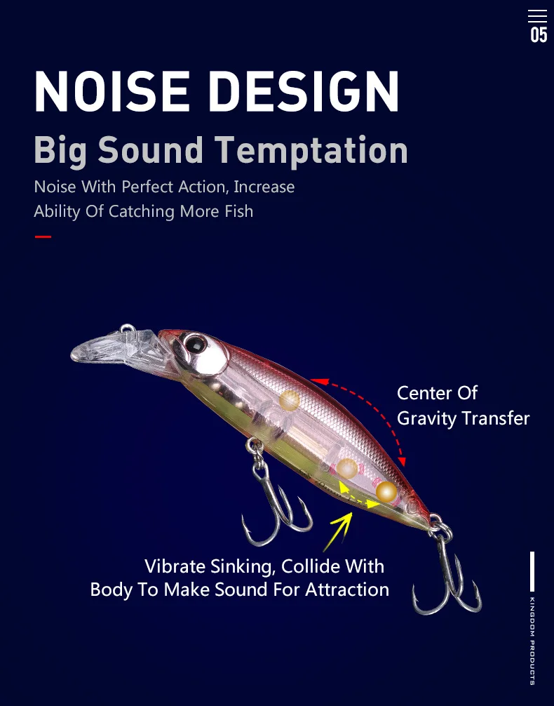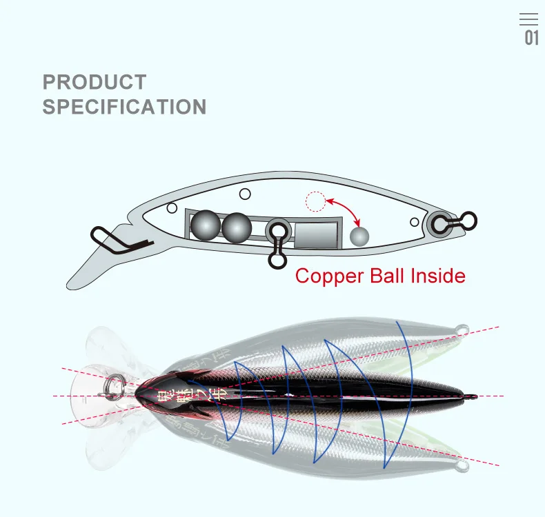 3.Hay una bola de cobre dentro del cuerpo del señuelo, el centro de gravedad se mueve hacia atrás después del lanzamiento. Cuando sacudas, el centro de gravedad avanza para mantenerlo en equilibrio durante un instante.