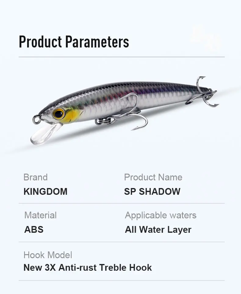 Señuelo de pesca KINGDOM SP Shadow, Minnow suspendido, 80mm, 95mm, 110mm, Wobblers artificiales de alta resistencia, Señuelos de aparejos de cebo duro Jerkbait