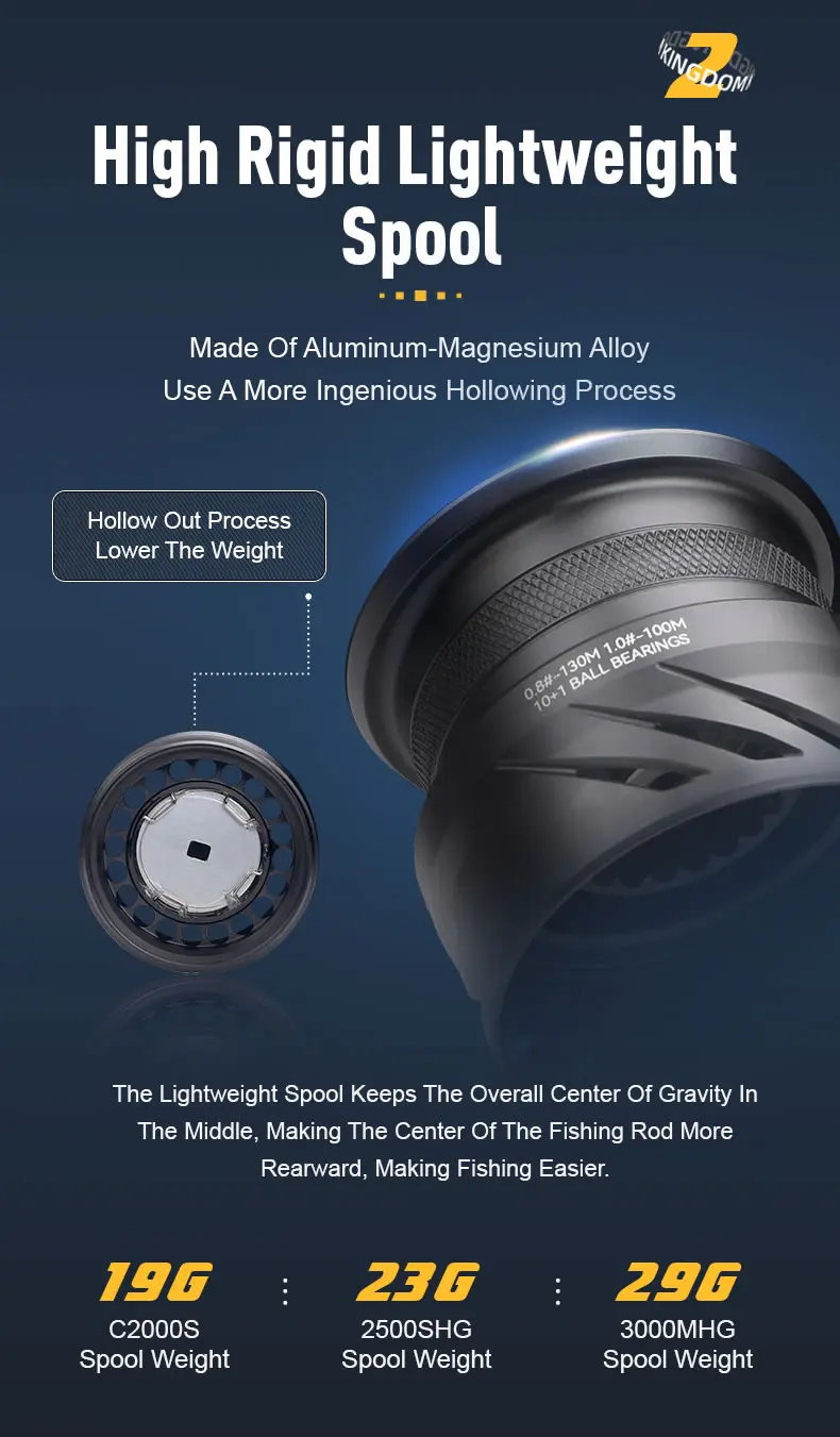 • Rueda de hilado de precarga:El DISEÑO DE rueca de precarga del Kingdom Tegmen garantiza que su línea se distribuya uniformemente, reduciendo el riesgo de enredos y problemas.