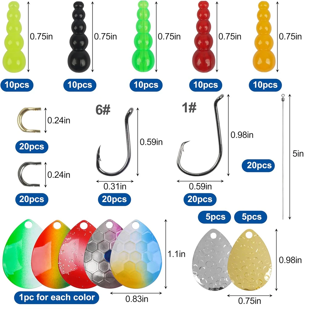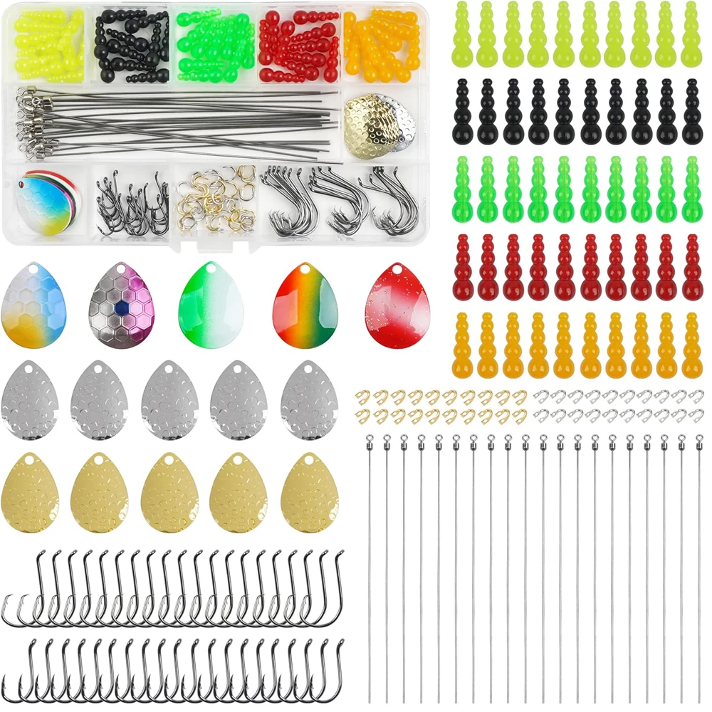 Incluye: Horquilla de giro fácil, señuelo de cuchillas, anzuelos circulares, cuentas de pesca, eje de alambre giratorio