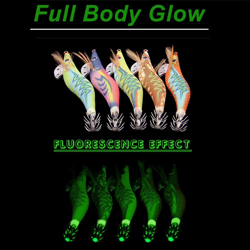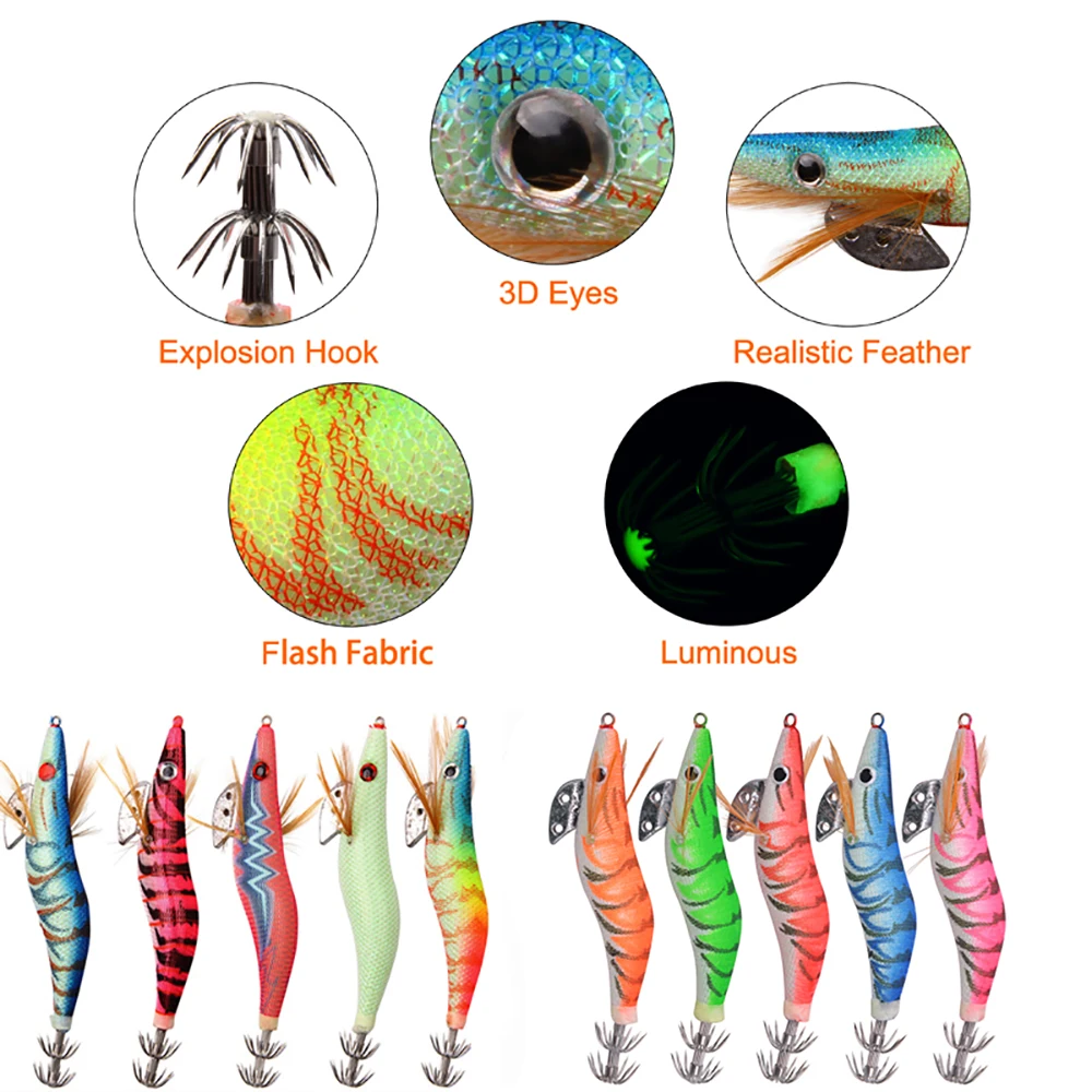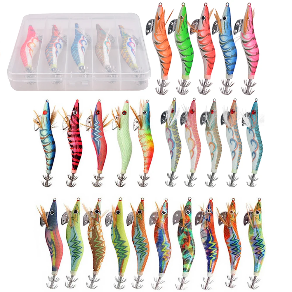 5 uds. Kit de jigs de calamar luminosos de agua salada, cebo de camarón de madera brillante multicolor, pulpo, sepia, señuelo de pesca, tamaño 2,5 #3,0 #3,5 #