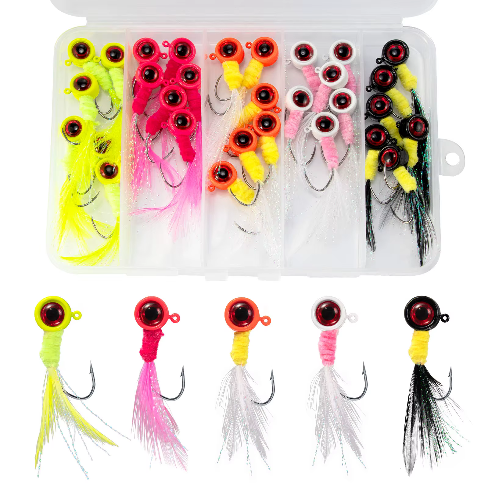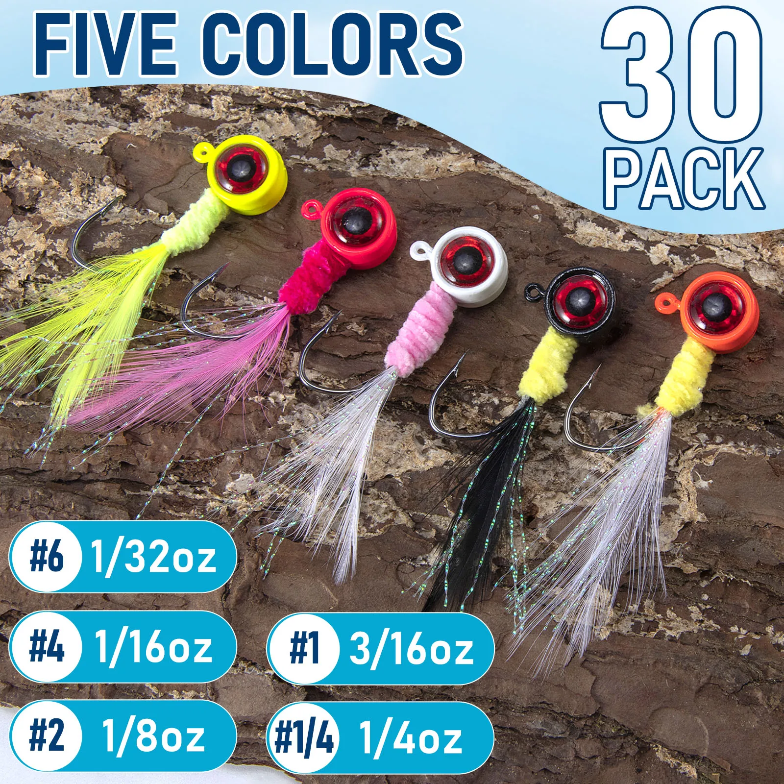 El paquete incluyeKit de 30 cabezales de pesca Marabou. Tamaño: 1/32oz 1/16oz 1/8oz 3/16oz 1/4oz. Cinco colores diferentes: rojo, chartreuse, naranja, blanco y negro.