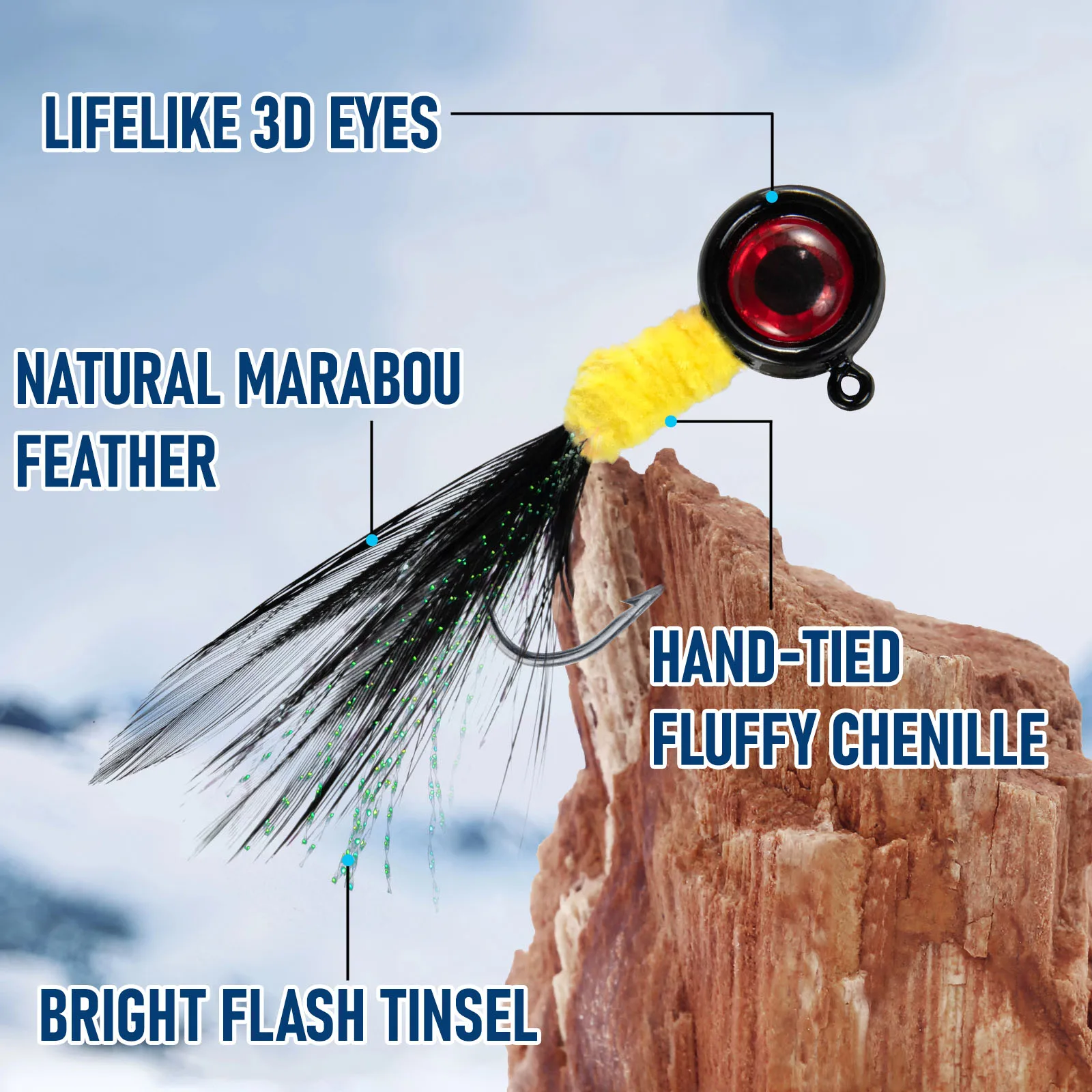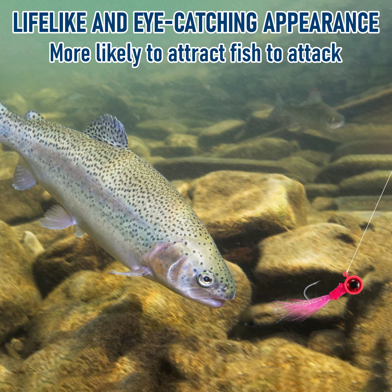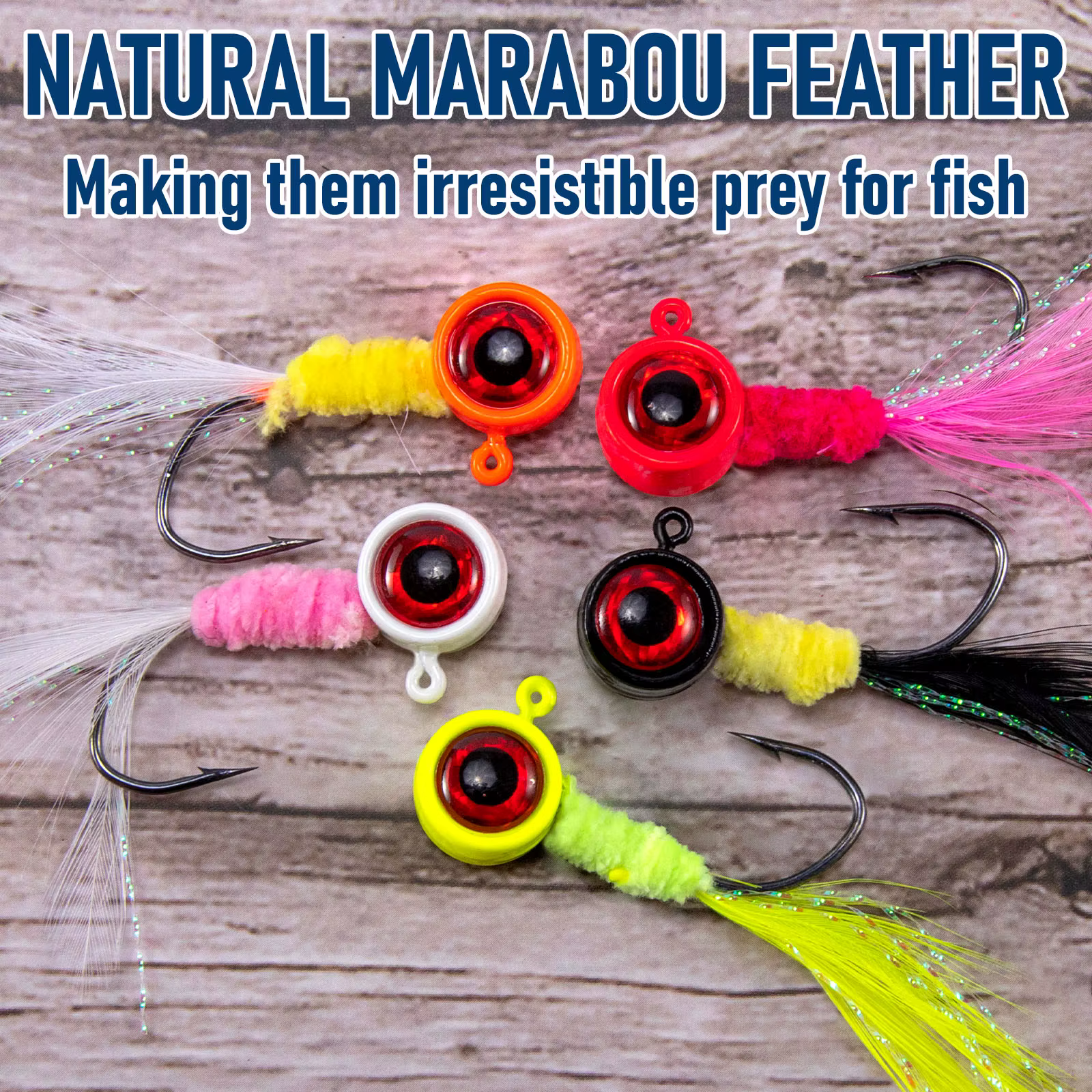 VIVID MARABOU JIGS:Estos anzuelos de pesca cuentan con ojos 3D realistas, diseño aerodinámico, cuerpo compacto y cola de plumas de marabú, lo que los convierte en presas irresistibles para los peces.