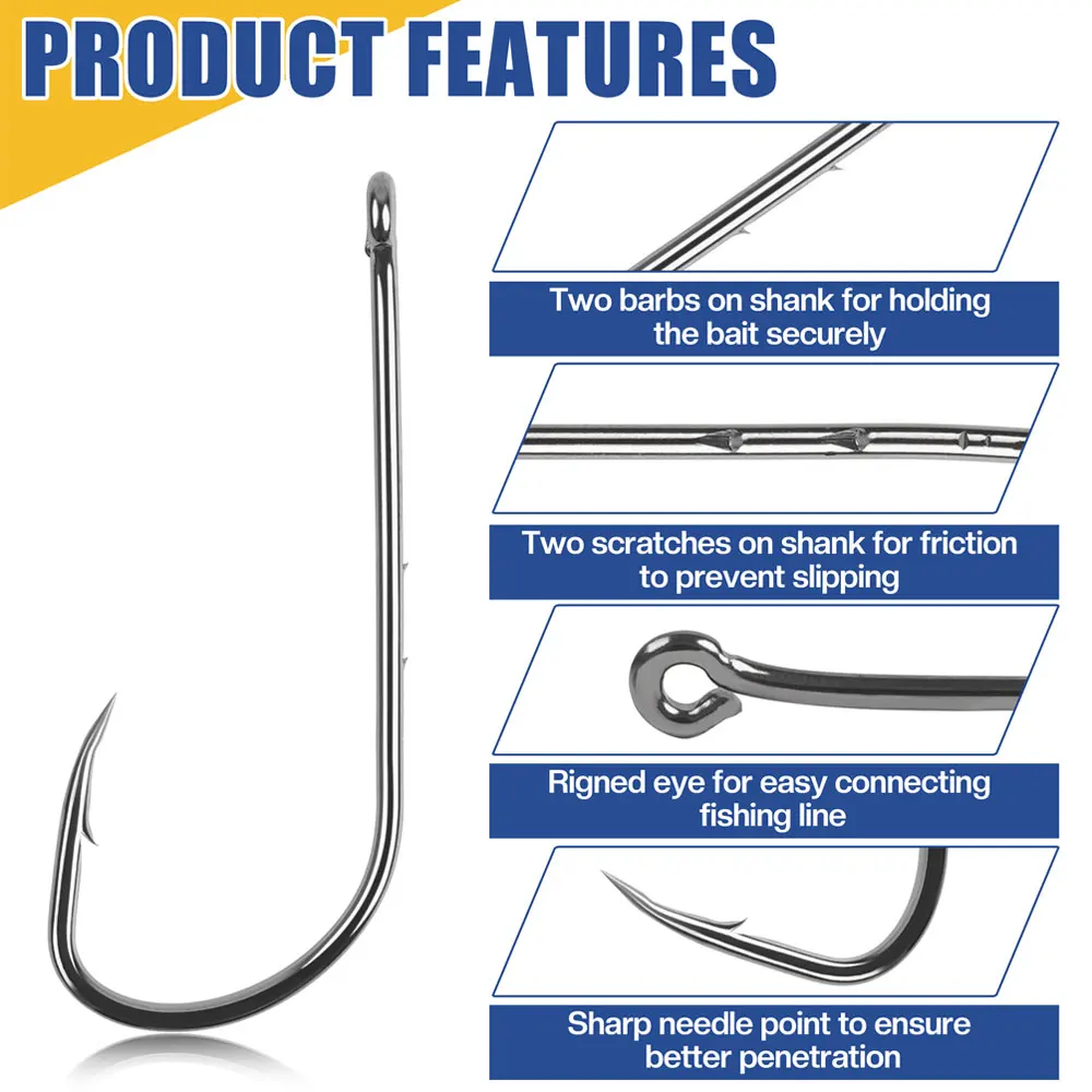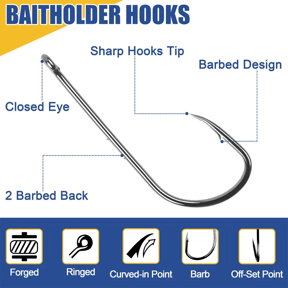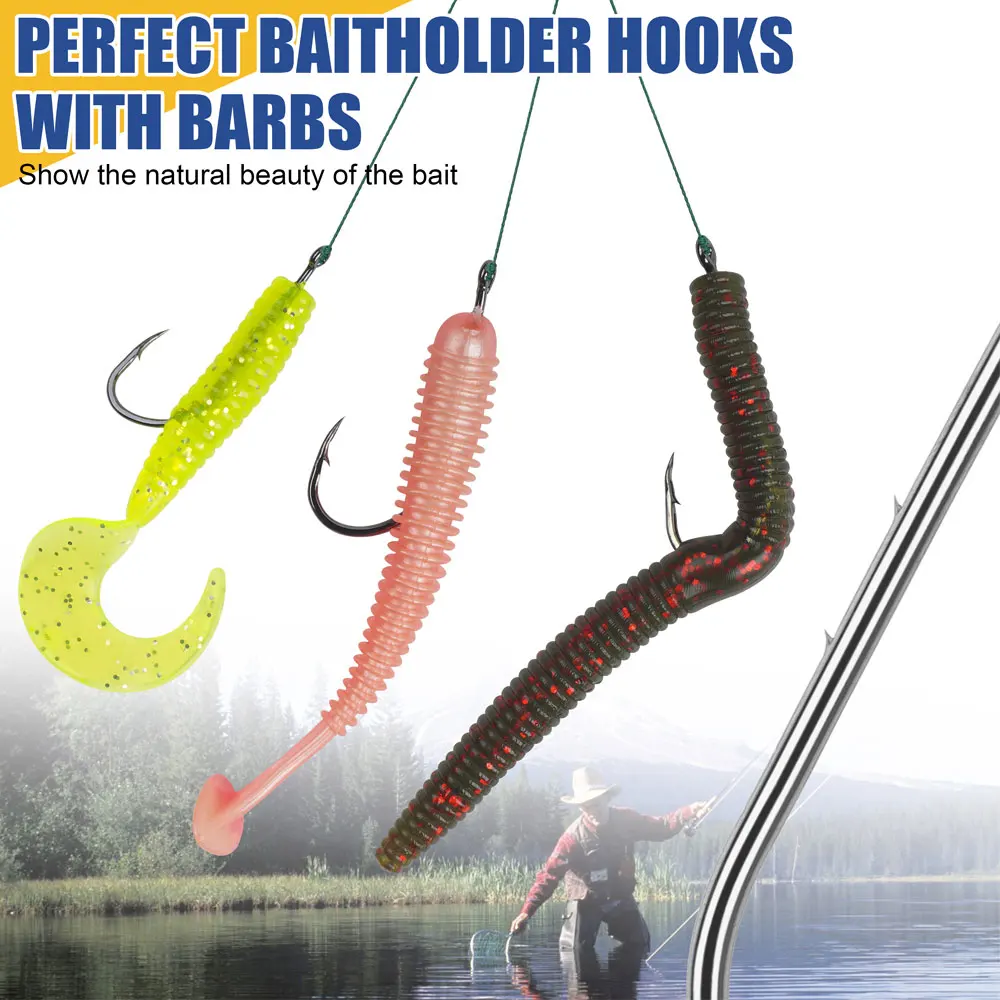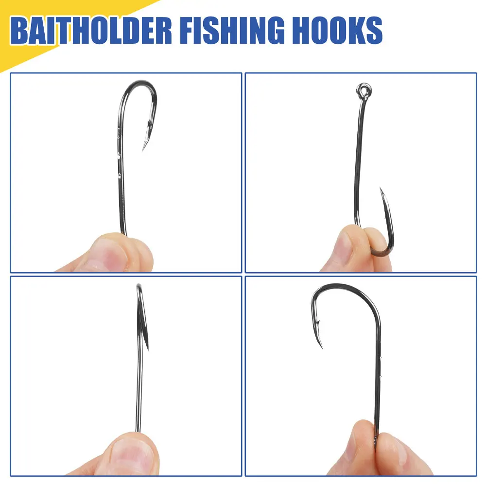 1. Los anzuelos de pesca Baitholder están hechos de materiales de acero de alto carbono, alta resistencia duradera y resistente a la corrosión, acabado de níquel negro, ideal para agua dulce y salada.