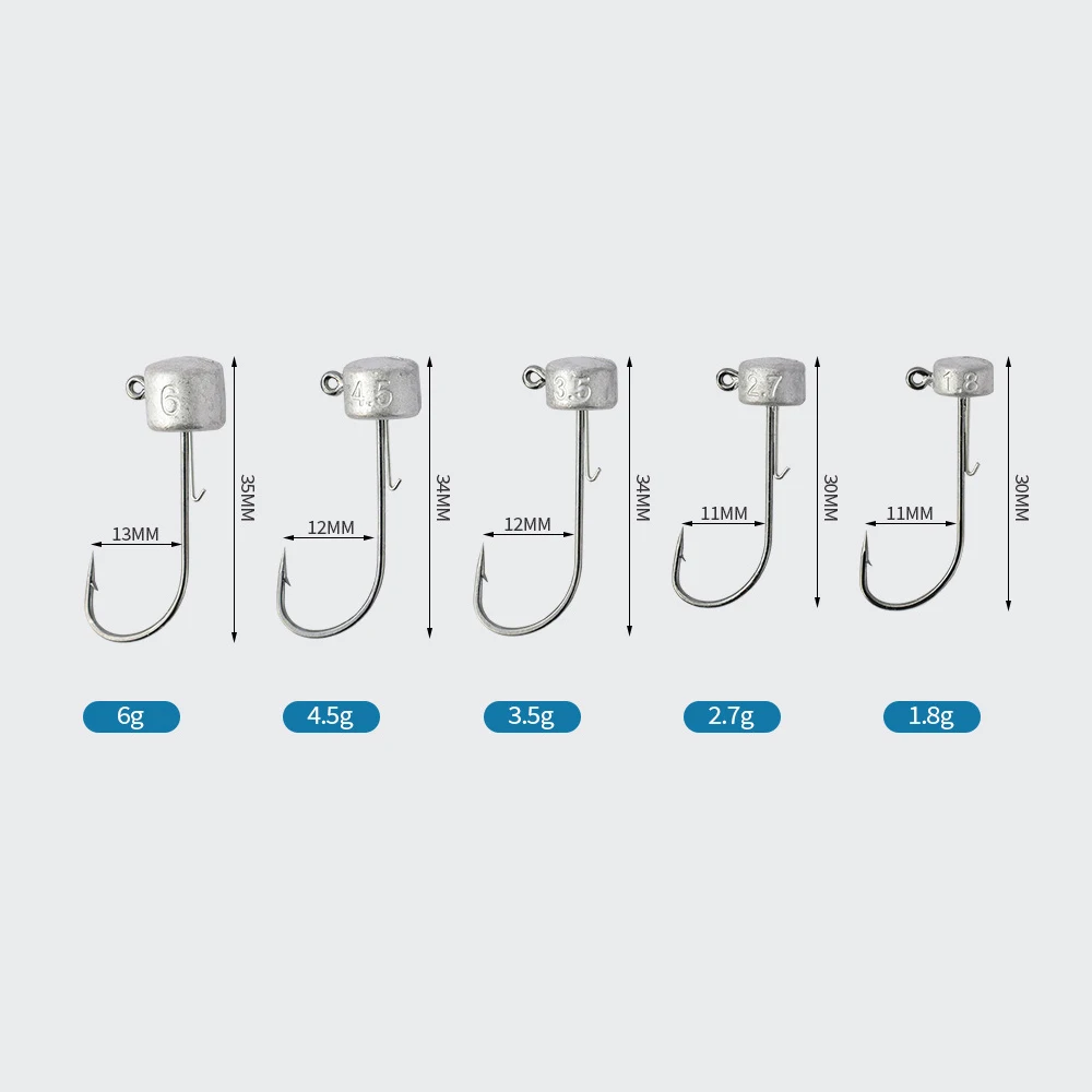 Kit de anzuelos De Seta fina para señuelos blandos, 5 piezas, 1,8g, 2,7g, 3,5g, 4,5g, 6g