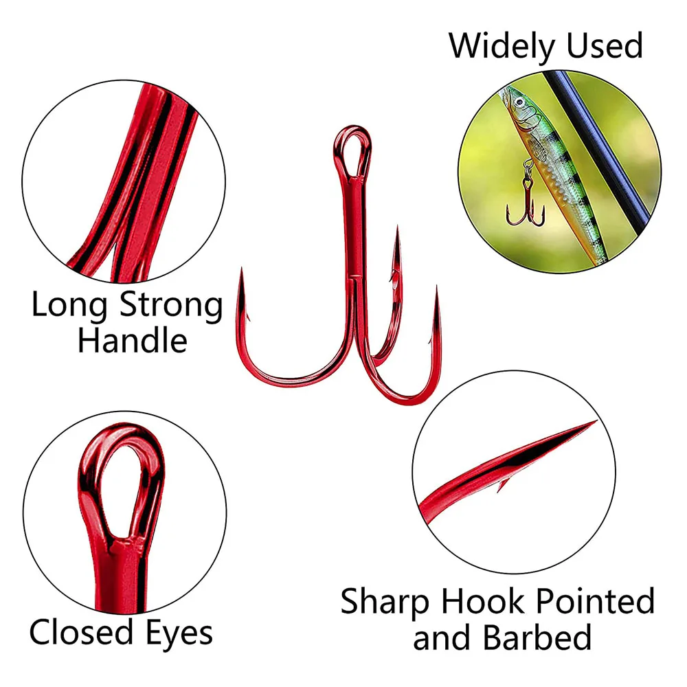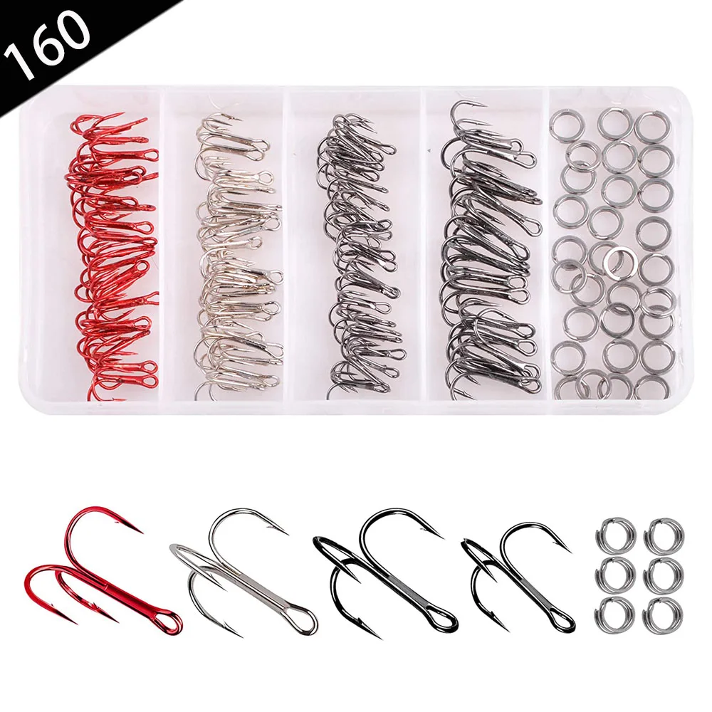 Kit de anzuelos triples de pesca, 160 unids/caja, anzuelos de pesca de lubina afilados, anzuelo Triple de agua salada con anillos divididos, ganchos de púas con caja de aparejos