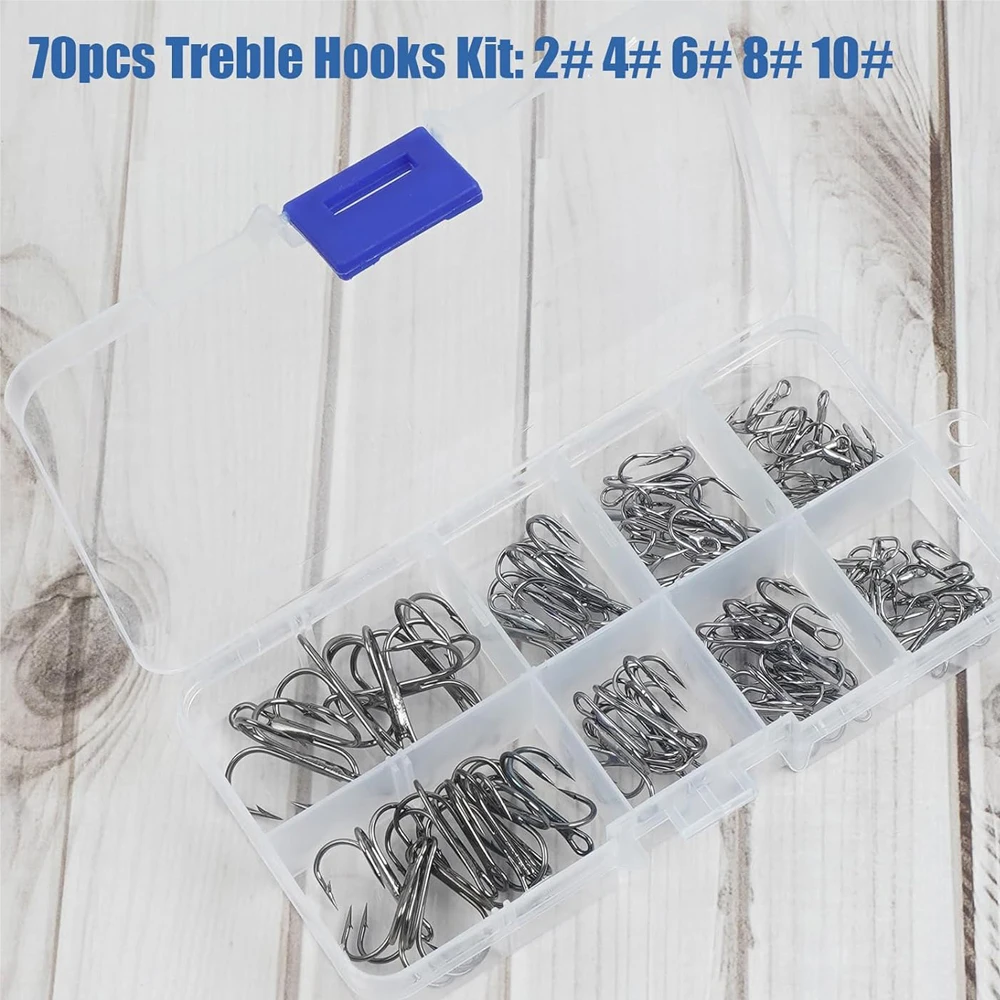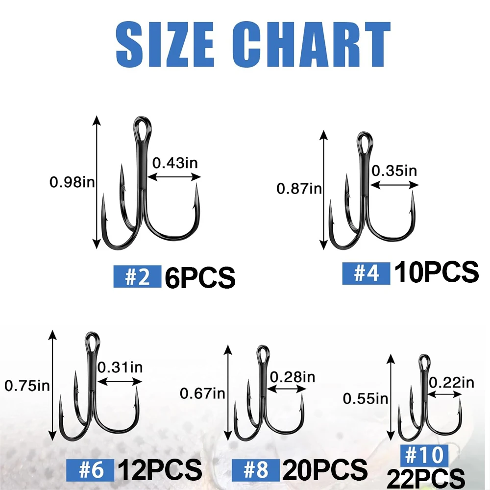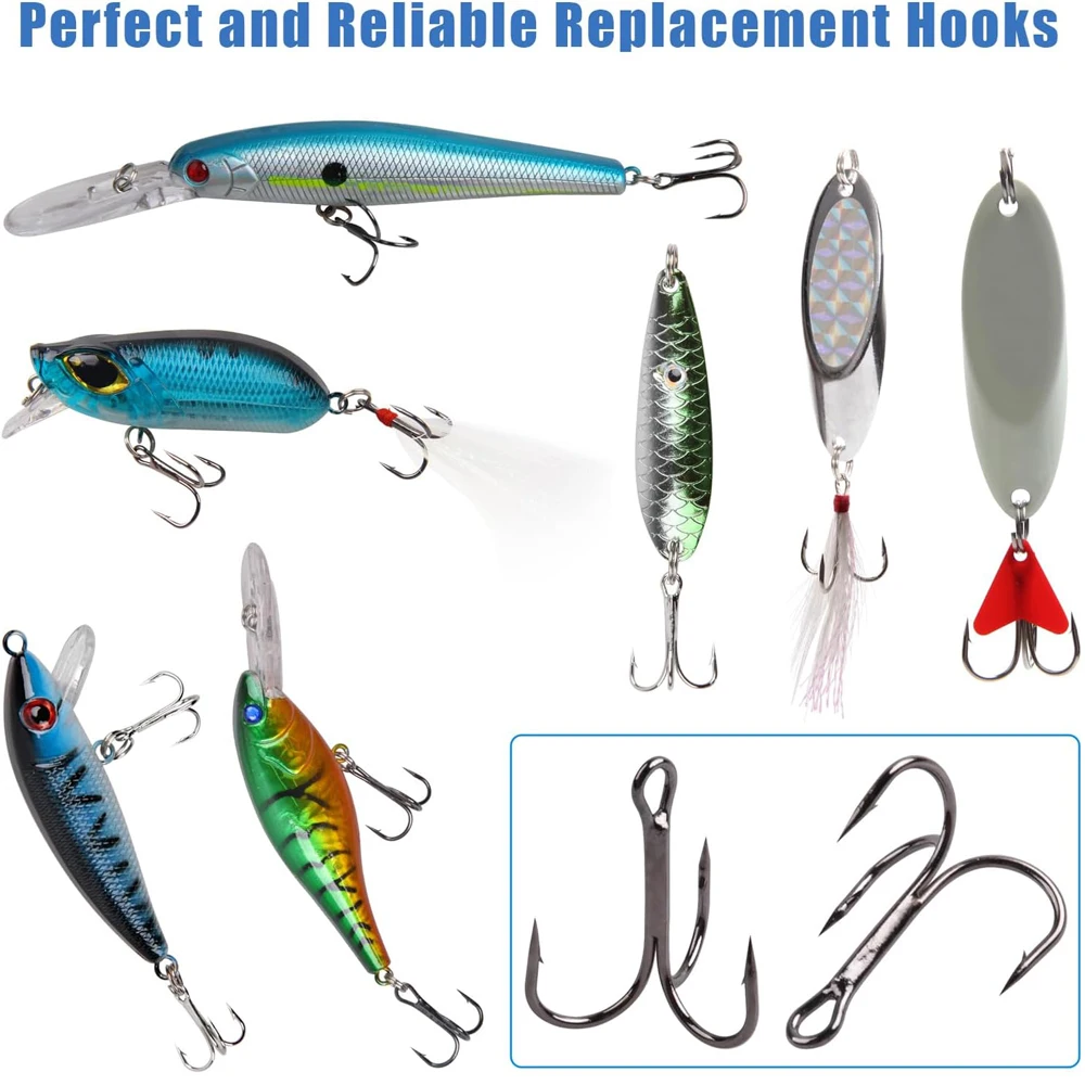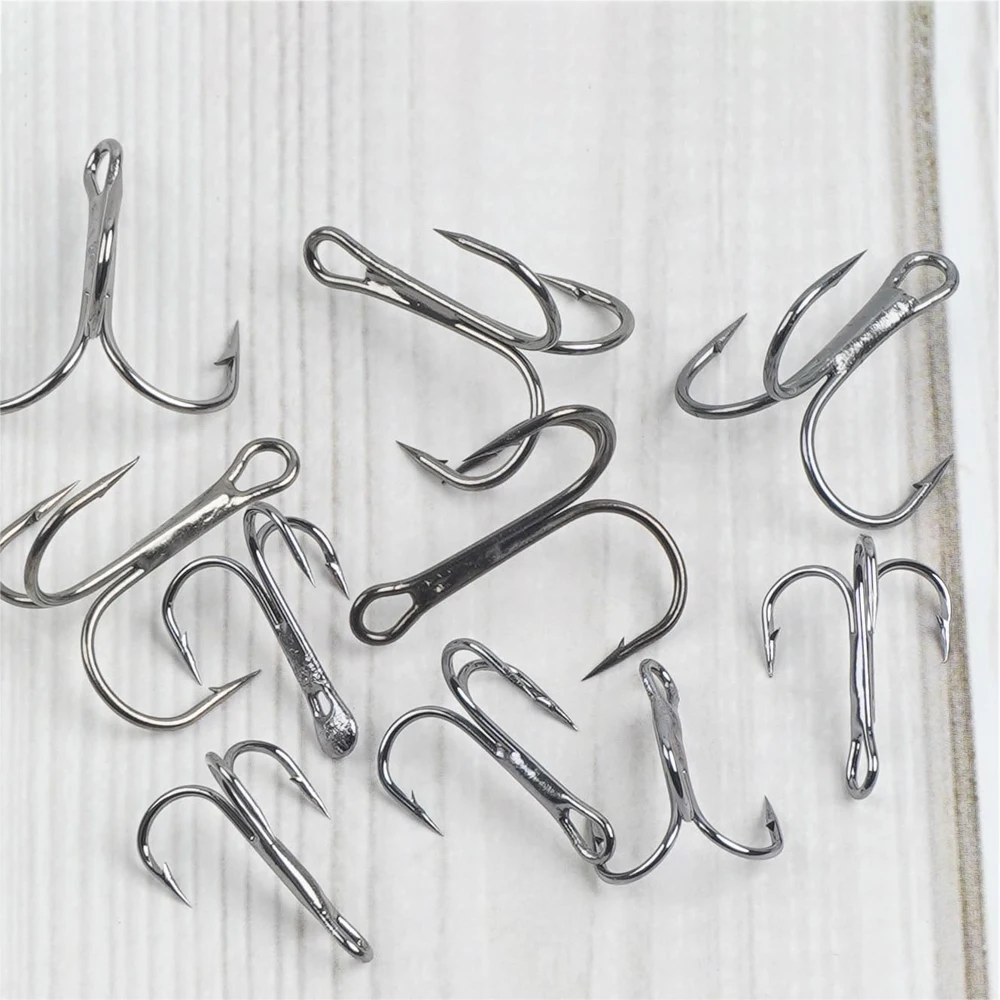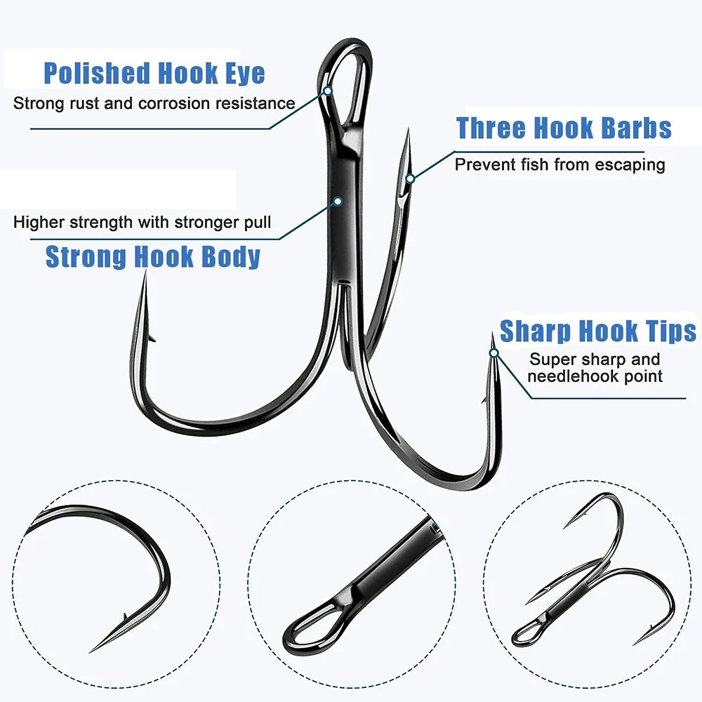 2. Ganchos triples hechos de acero fuerte de Alto carbono con revestimiento de níquel negro. Súper puntas de aguja, anzuelos de agua dulce de agua salada muy afilados para atrapar los peces grandes.