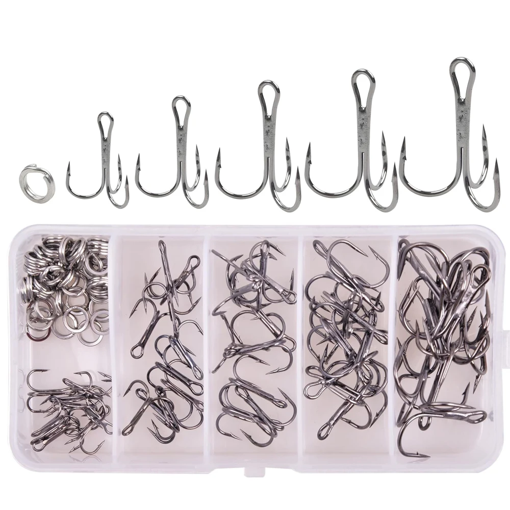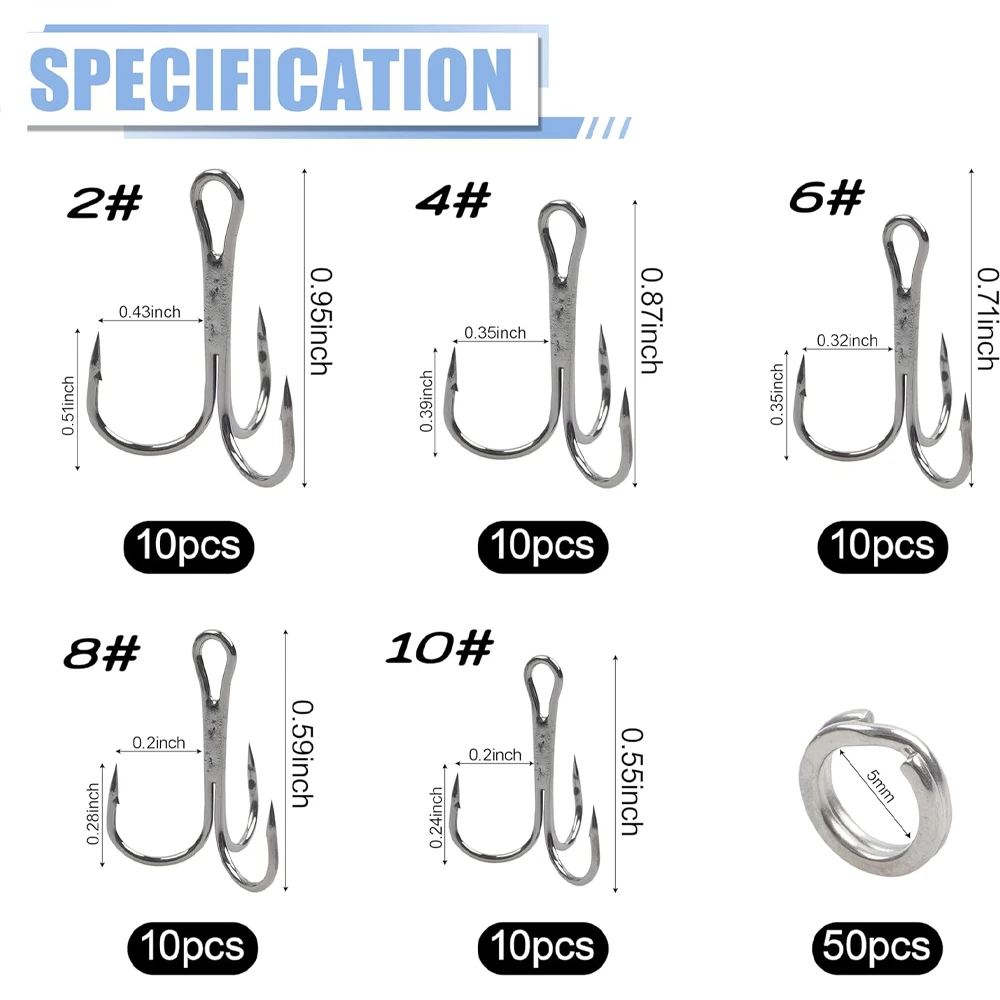 1.El juego de anzuelos triples negros incluye 50 anzuelos triples de pesca en 5 tamaños diferentes, 2#-10 piezas, 4#-10 piezas, 6#-10 piezas, 8#-10 piezas, 10#-10 piezas y 50 anillos divididos.