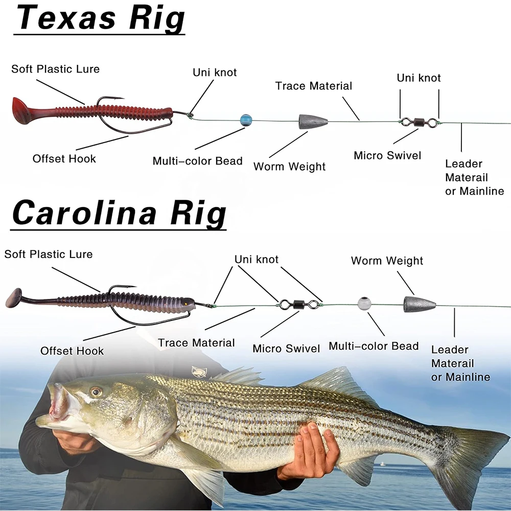 【AMPLIAMENTE APLICABLE】El aparejo de Texas y Carolina se ha utilizado durante muchas décadas para la pesca de lubina y perca, especialmente adecuado para la pesca de fondo en aguas profundas. Maravillosos aparejos de pesca para sus viajes de pesca