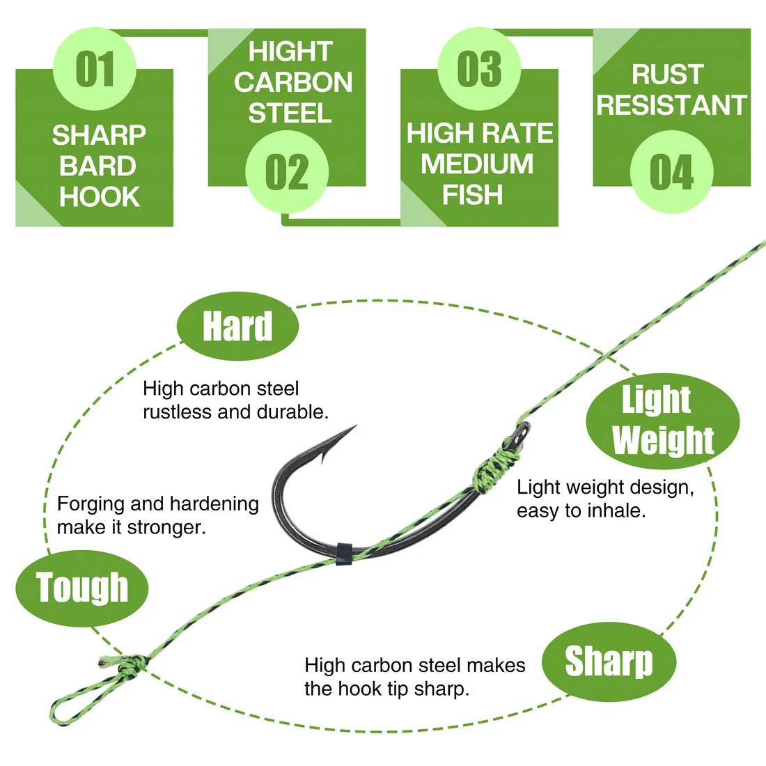Incluyendo: ganchos de carpa preatados, peso de carpa, broches de peso, mangas antienredos y broches giratorios de carpa