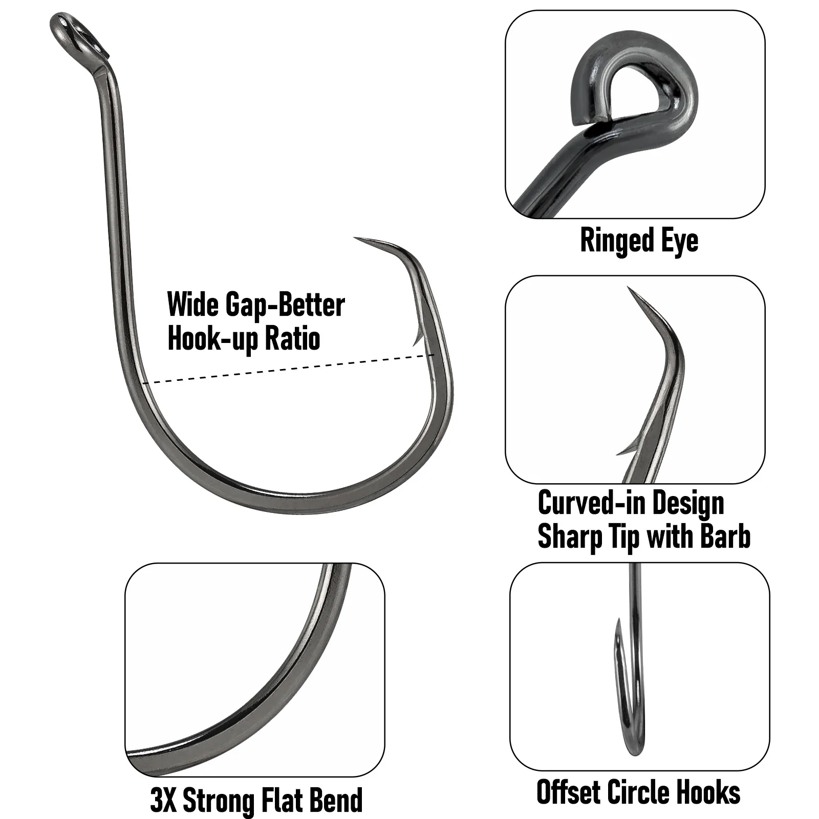 3 ganchos circulares fuertes: construidos con material negro de primera calidad con un amplio espacio de níquel, vástago engrosado y Punta de púas curvada, Estos ganchos circulares ofrecen una resistencia superior y una durabilidad increíble, puede penetrar rápidamente y sujetar a los peces firmemente.