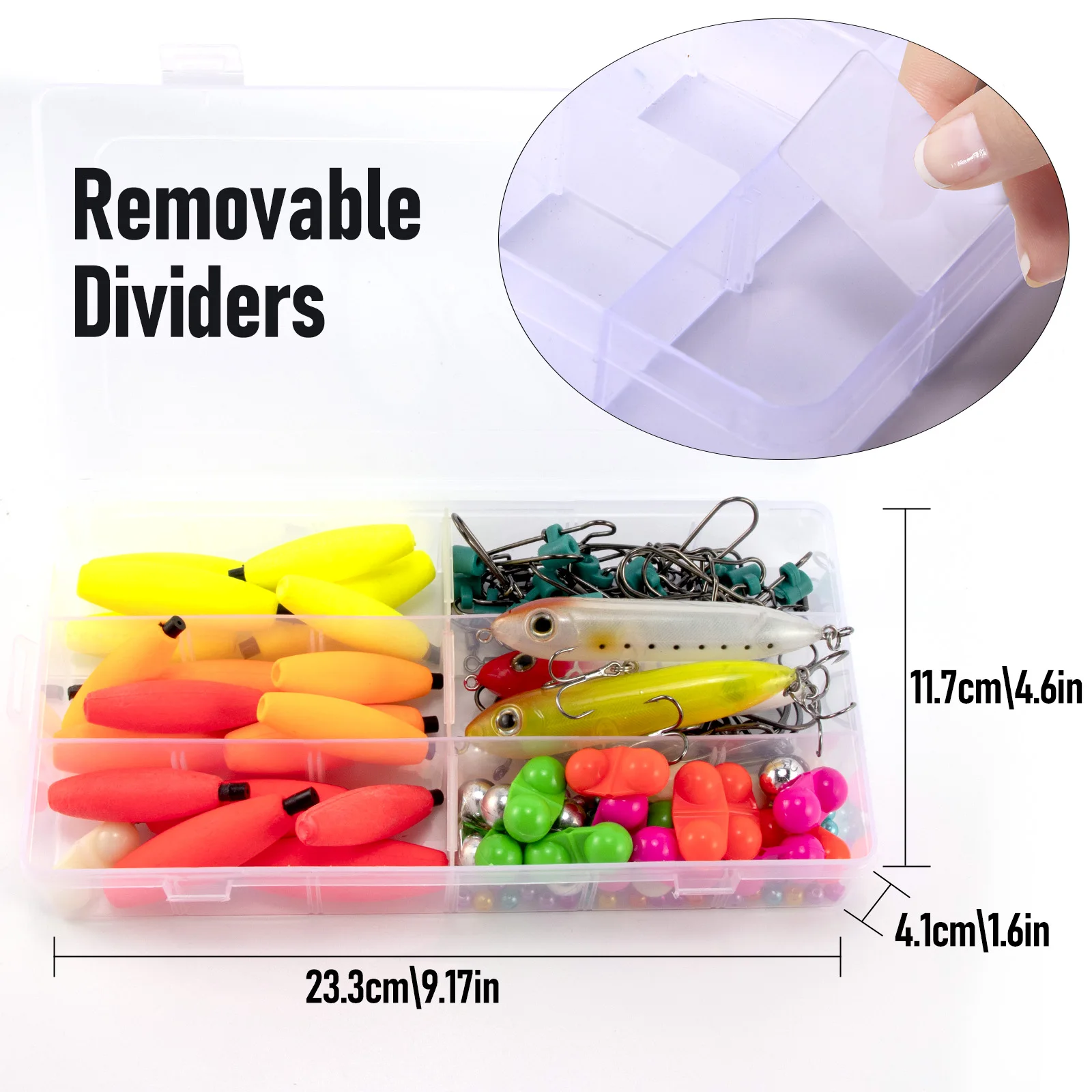 El juego completo incluye: 21/3 tamaños (5/0, 6/0, 7/0, 8/0) * anzuelos circulares compensados, 3 * señuelos de bagre (largo: 10cm), 18/2 tamaños (5,8 cm, 5cm) * flotadores de clavija EVA, 5 colores/5 colores * sonajeros de bagre, 18/2 tamaños (100 cm, 5cm) * CUENTAS DE PESCA DE/5 colores. 21 deslizadores de plomo *, 21 * barril giratorio (43 kg), 1 caja de aparejos de pesca (23,3*11,7*4,1 cm).
