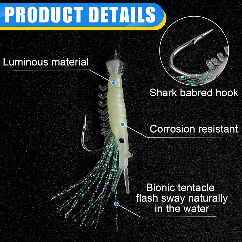 DISEÑO REALISTA: Los aparejos de camarones luminosos diseñados con detalles corporales de alta resolución, cuentas luminosas y sedas brillantes hacen que parezca un camarón real con acciones de natación realistas y de manera más vívida.