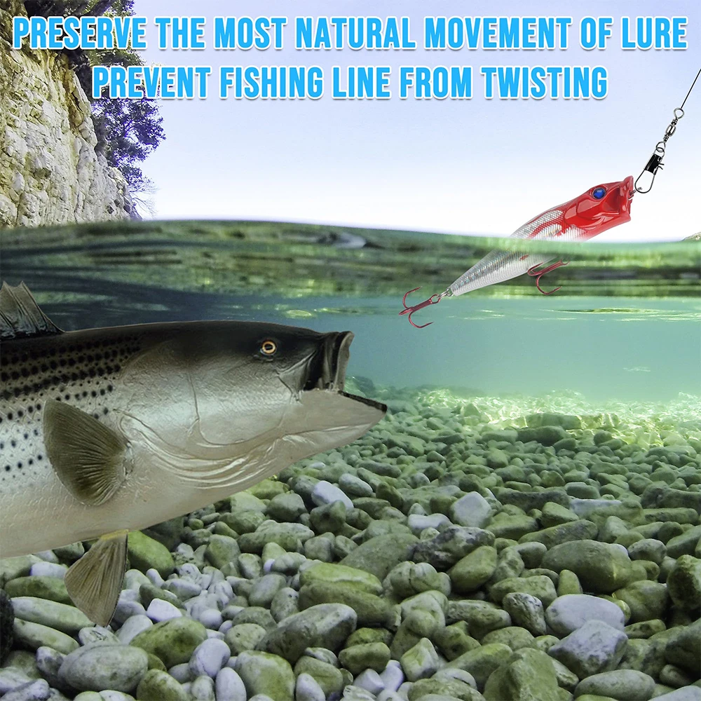 Sin torsión: los giratorios a presión pueden girar suavemente 360° y el movimiento del cebo será más realista.La superficie está tratada de manera que sea particularmente lisa y no afecte en absoluto la línea.