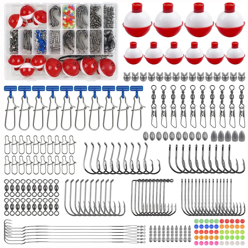 2. El Kit de accesorios de pesca de 220 piezas incluye 25 anzuelos de baitholder, 10 anzuelos circulares, 10 anzuelos de plantilla Aberdeen, 10 anzuelos de cebo vivo, 6 aparejos de anzuelo, 15 plomadas de tiro dividido, 10 plomadas de huevo, 10 pesas de clavos, 5 plomadas de bala, 20 eslabones giratorios de grúa, 20 broches de presión dúo, 10 broches giratorios de barril, 10 deslizadores de plomo, 10 bobbers de pesca y 50 cuentas.