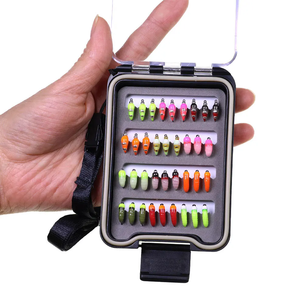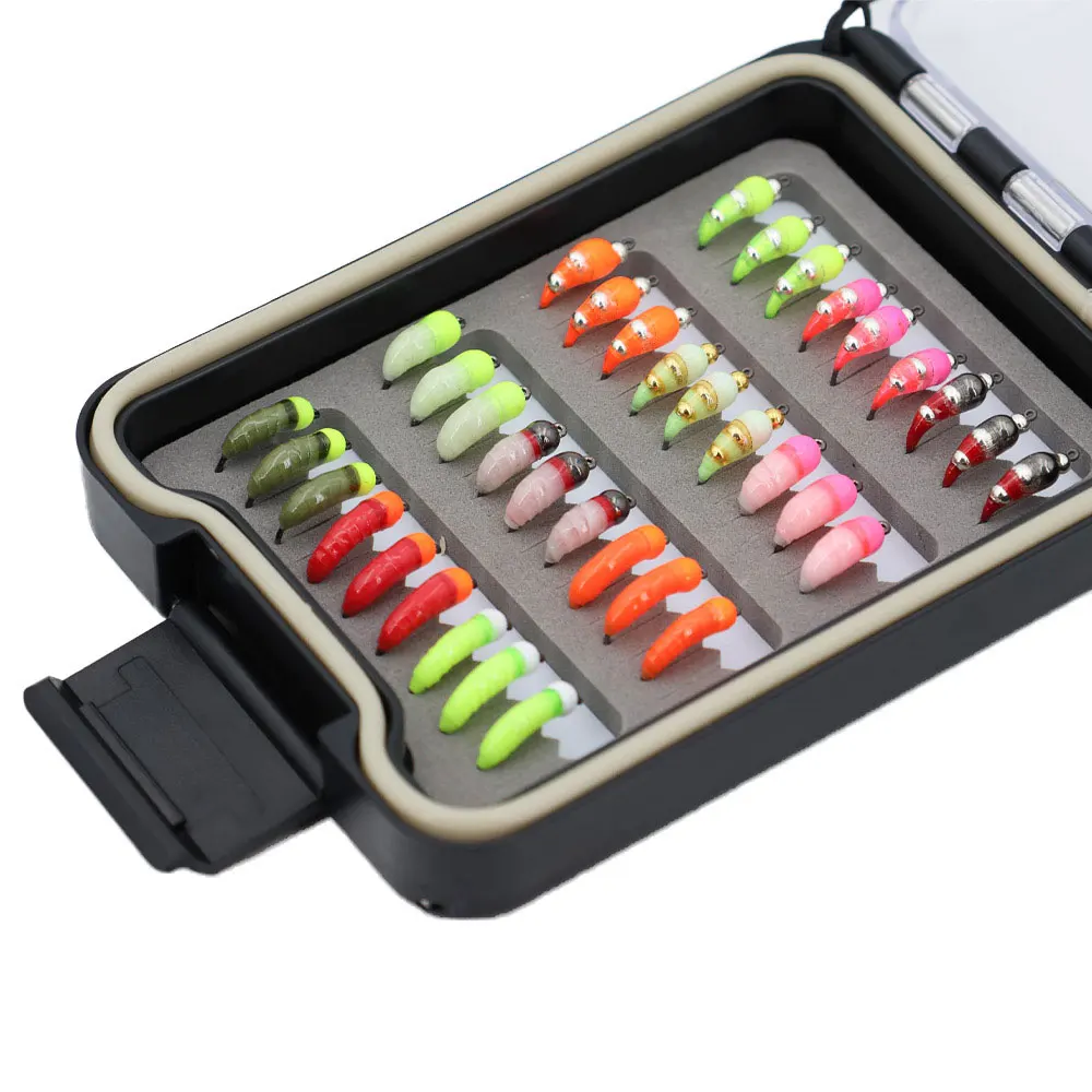 Bimoo-Kit/caja de moscas de 36 Uds., cabezal de cuentas de latón de hundimiento rápido, gusano de insectos y epoxi, ninfa de mosca, plantilla de hielo, señuelos de pesca, trucha, carpa, señuelo de pesca