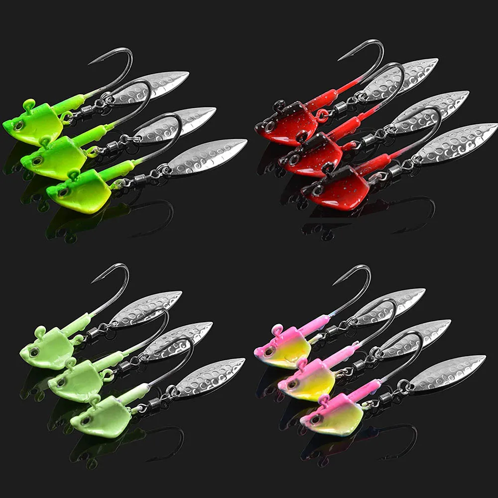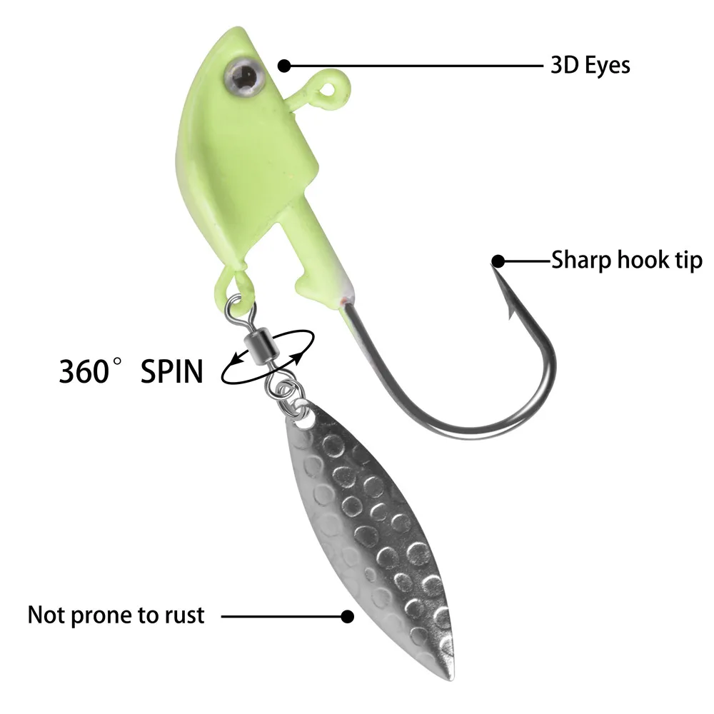 Anzuelos de pesca con cabeza de plantilla de plomo de 12 con hoja giratoria anzuelo de plantilla de gusano 3D ojos de pez Spinners señuelo Bass Jigging aparejo de pesca