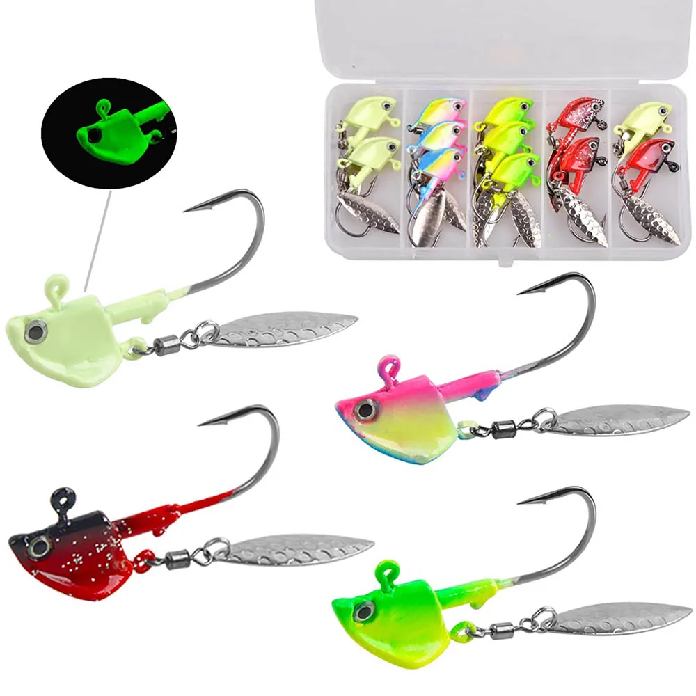Anzuelos de pesca con cabeza de plantilla de plomo de 12 con hoja giratoria anzuelo de plantilla de gusano 3D ojos de pez Spinners señuelo Bass Jigging aparejo de pesca