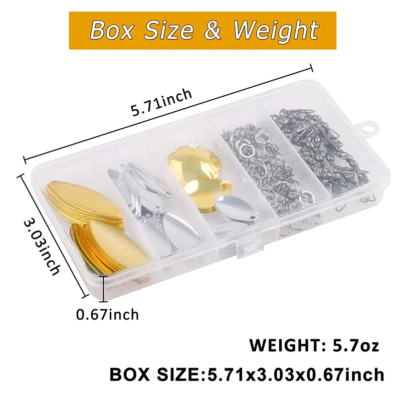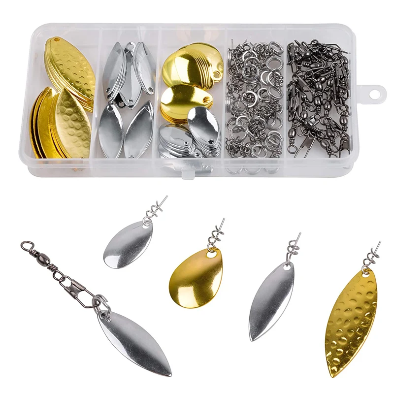 Material: Hoja de lentejuelas de aleación de metal, anillos divididos de acero inoxidable, eslabón giratorio de latón, bloqueo de cebo de acero inoxidable
