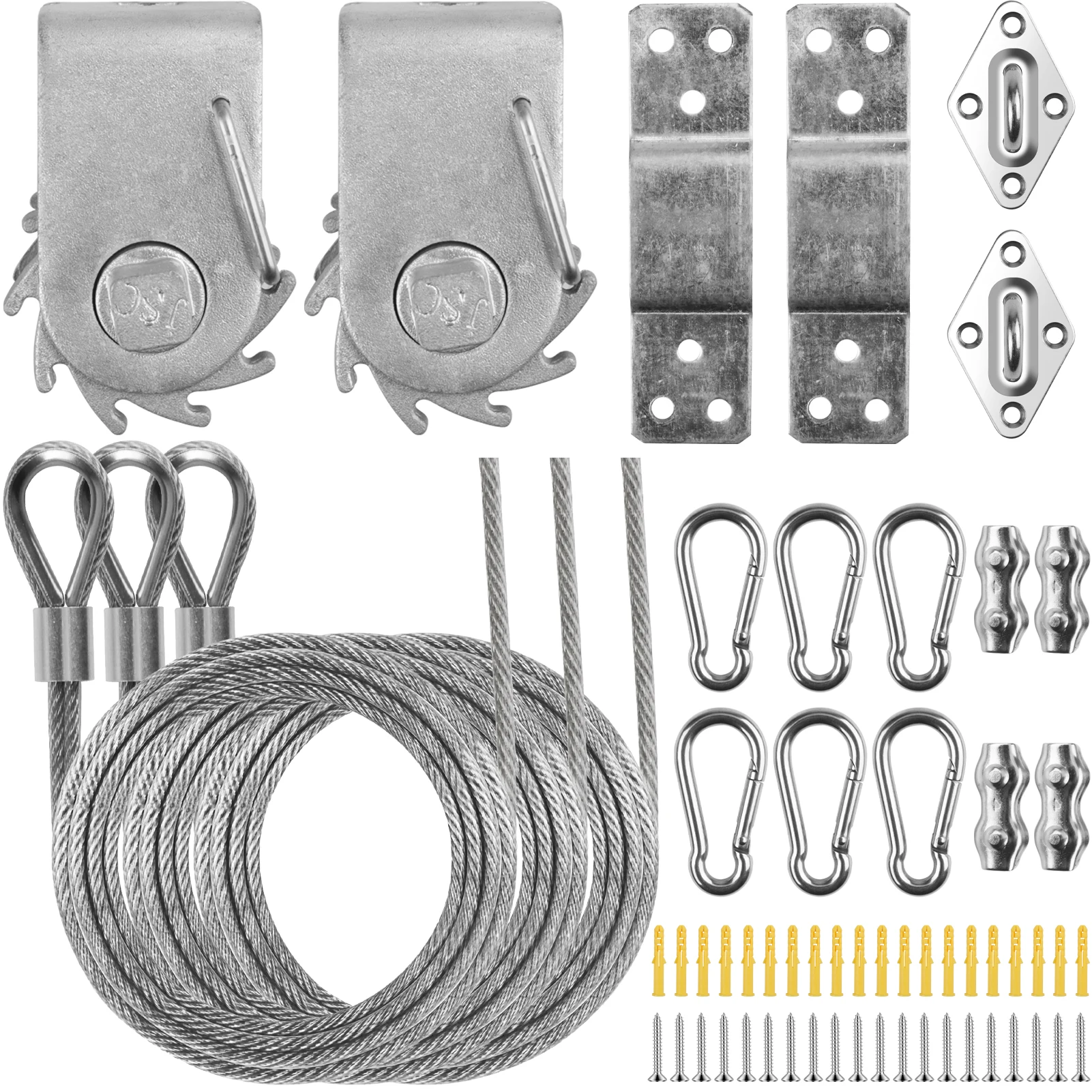 🛠️【Kit de herrajes para parasol de 60 piezas】 Incluye 2 cabrestantes de trinquete, 4 cables de 2 m, 2 ojos de almohadilla, 4 clips para cables de poste M422, 6 mosquetones, 20 tornillos, 20 pernos de expansión de plástico.