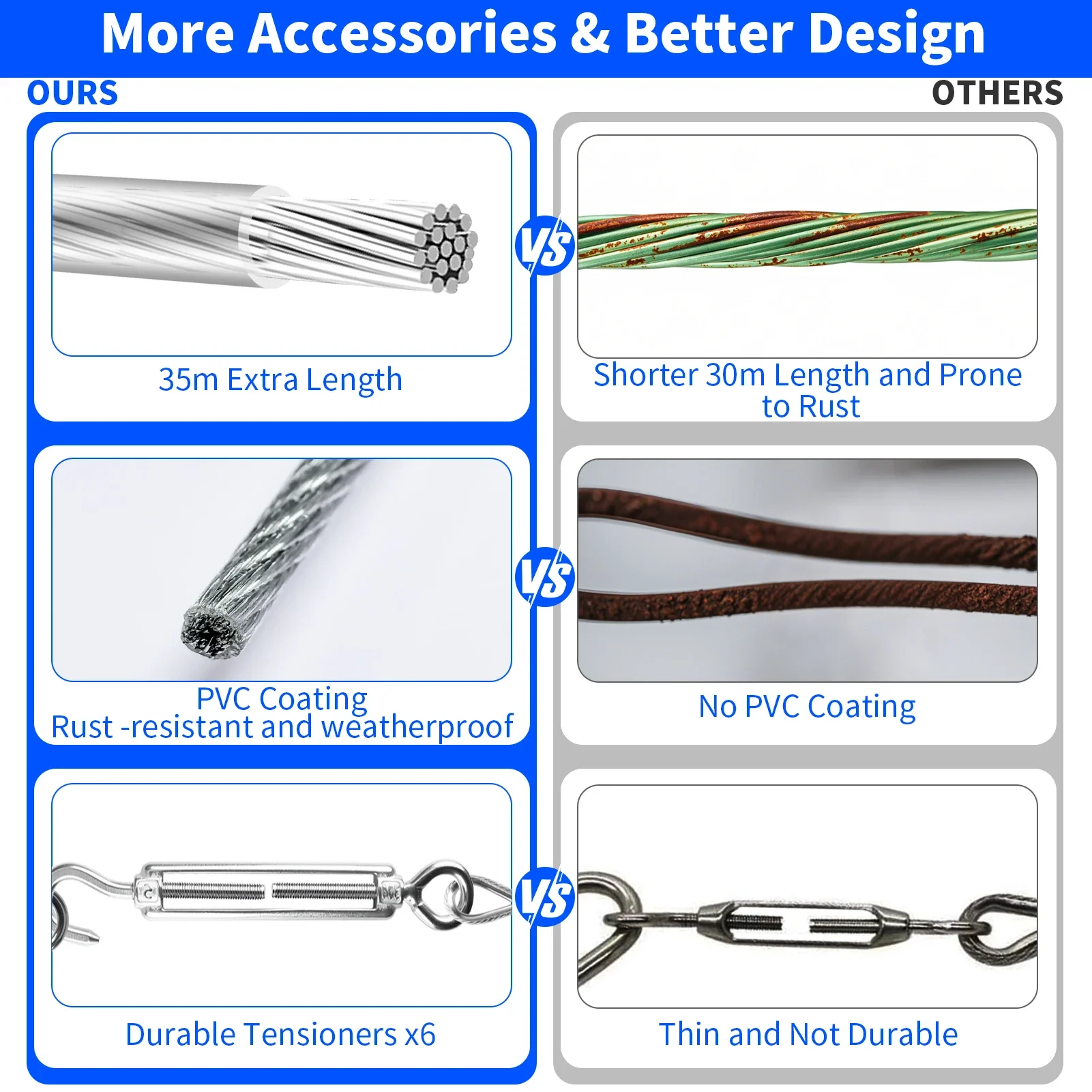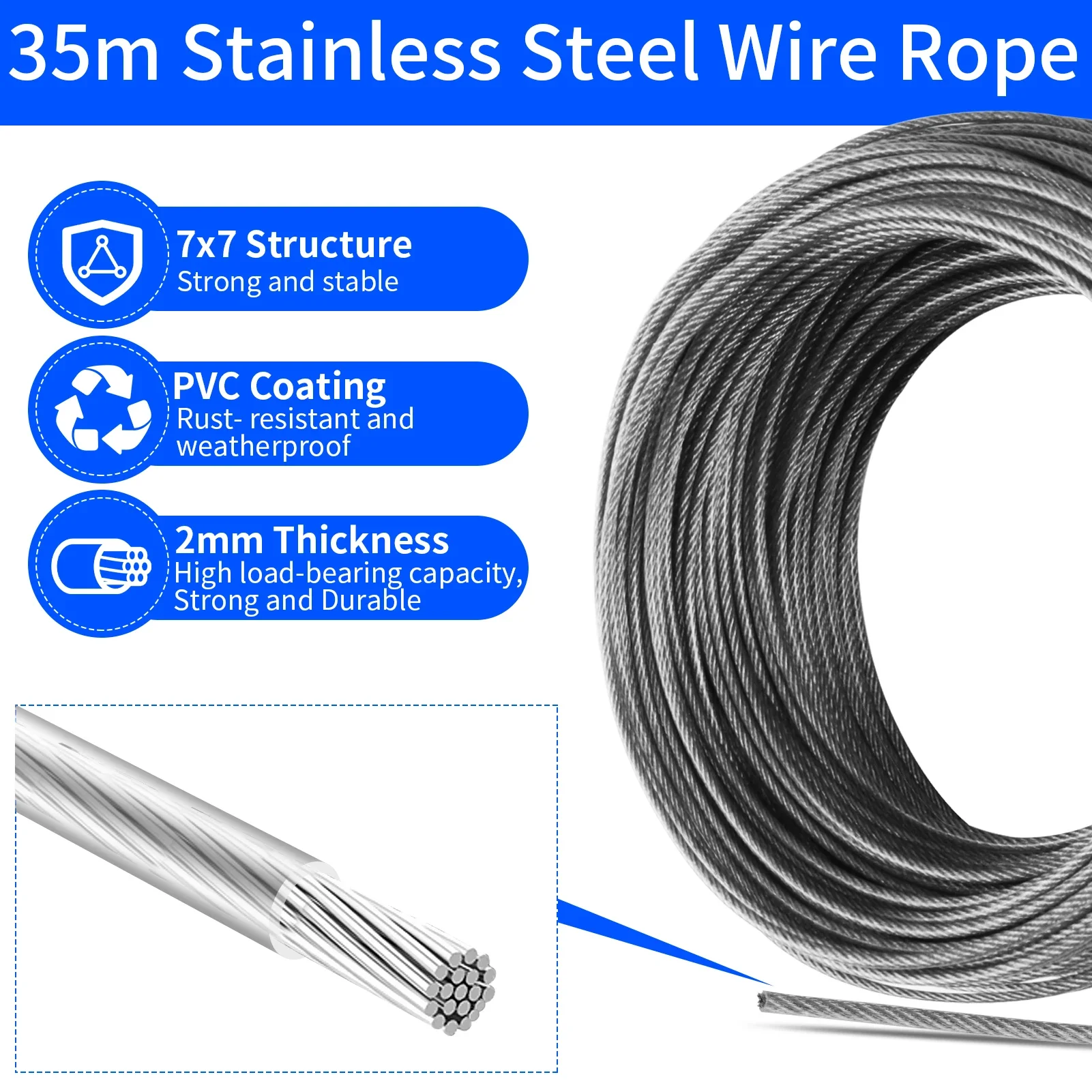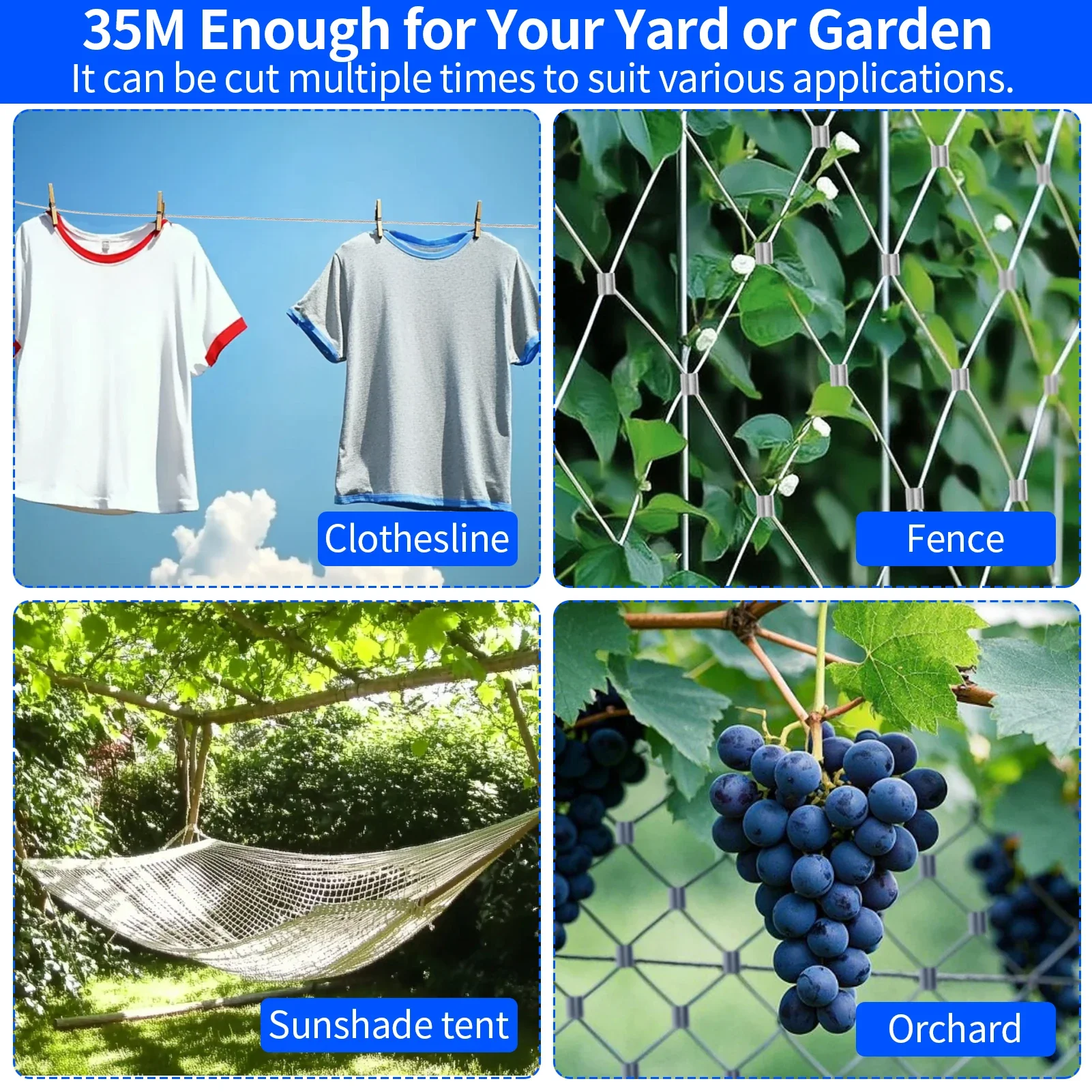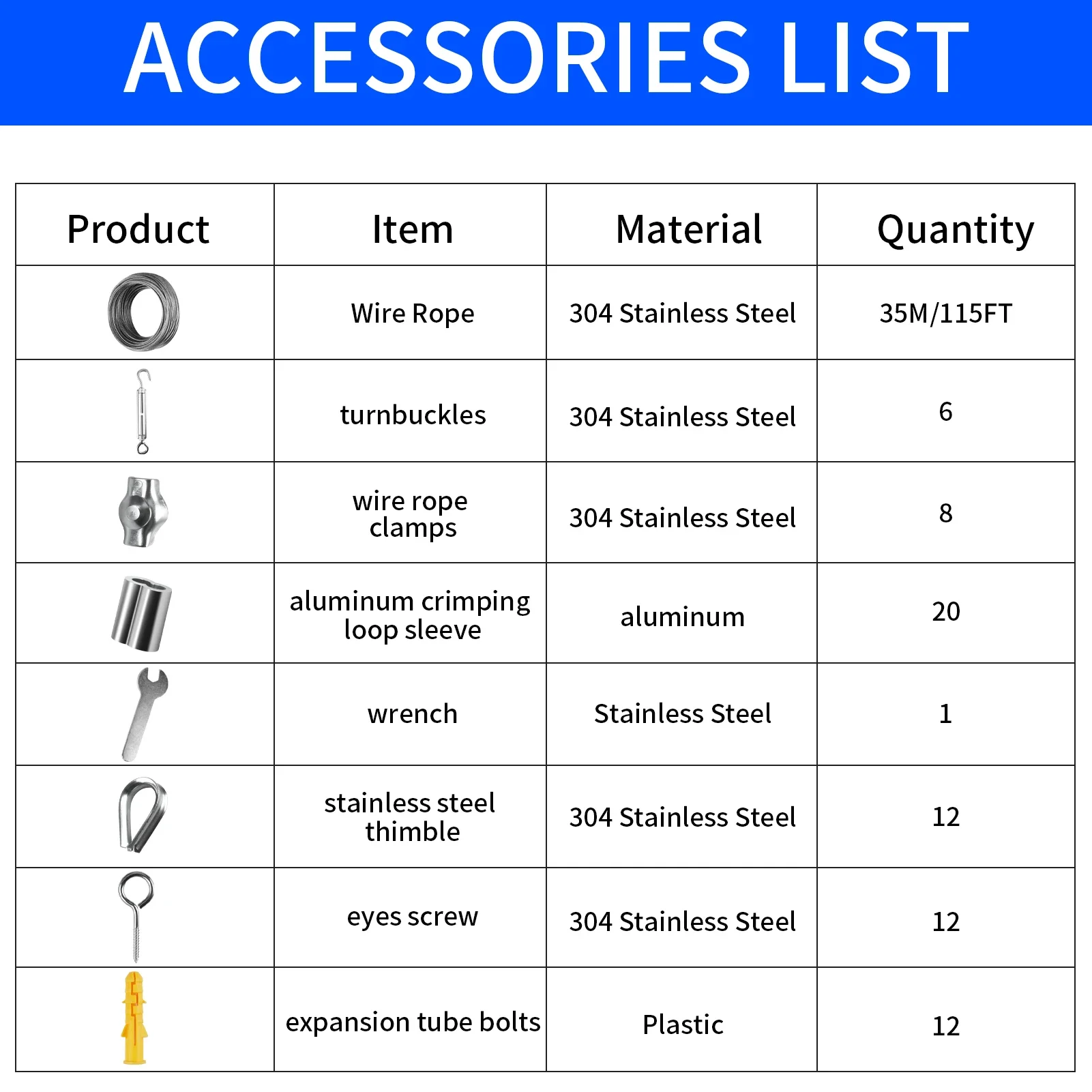 🛠️JUEGO COMPLETO DE HERRAMIENTAS: Incluye 35 metros de cable de acero inoxidable (2 mm), 6 esticadores M4, 8 abrazaderas de cable de un solo alambre M3, 20 manguitos de bucle de engarzado de aluminio M2, dedal de acero inoxidable M2, 12 tornillos de ojos, 12 tornillos de tubo de expansión, 1 llave, accesorios completos, no se necesitan piezas adicionales