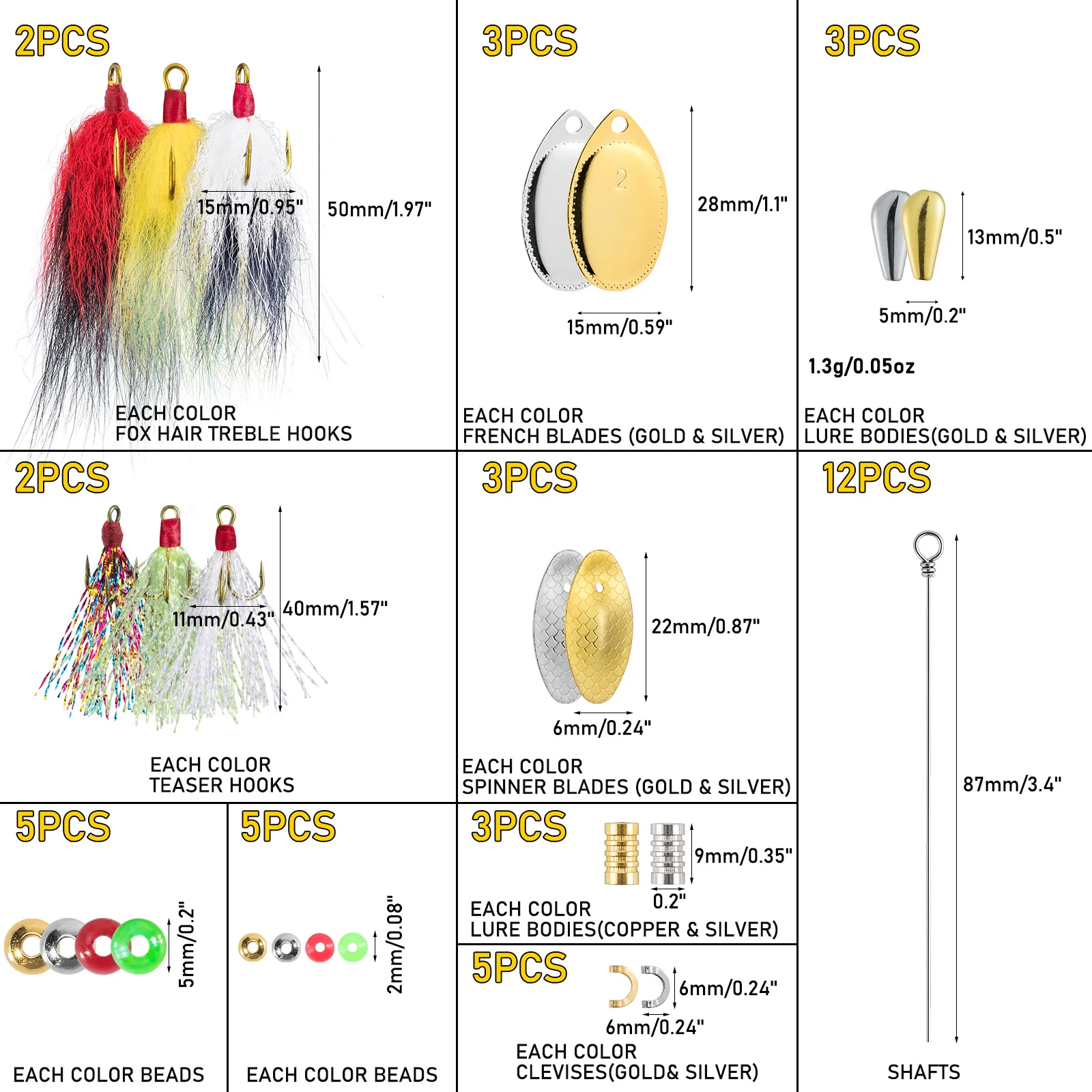 Paquete:Este surtido contiene 12 ejes, 12 cuchillas giratorias, 10 Cleves, 12 cuerpos de señuelos, 20 ganchos triples, 40 cuentas. Ver imagen para ver tamaños detallados
