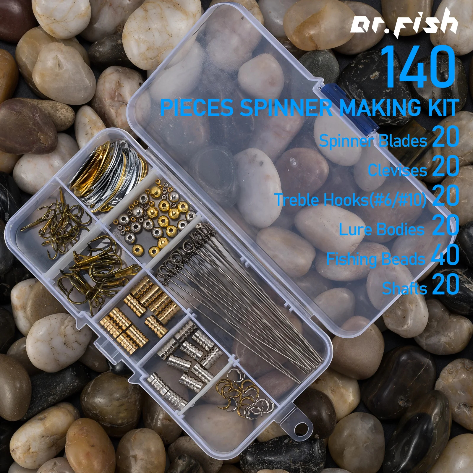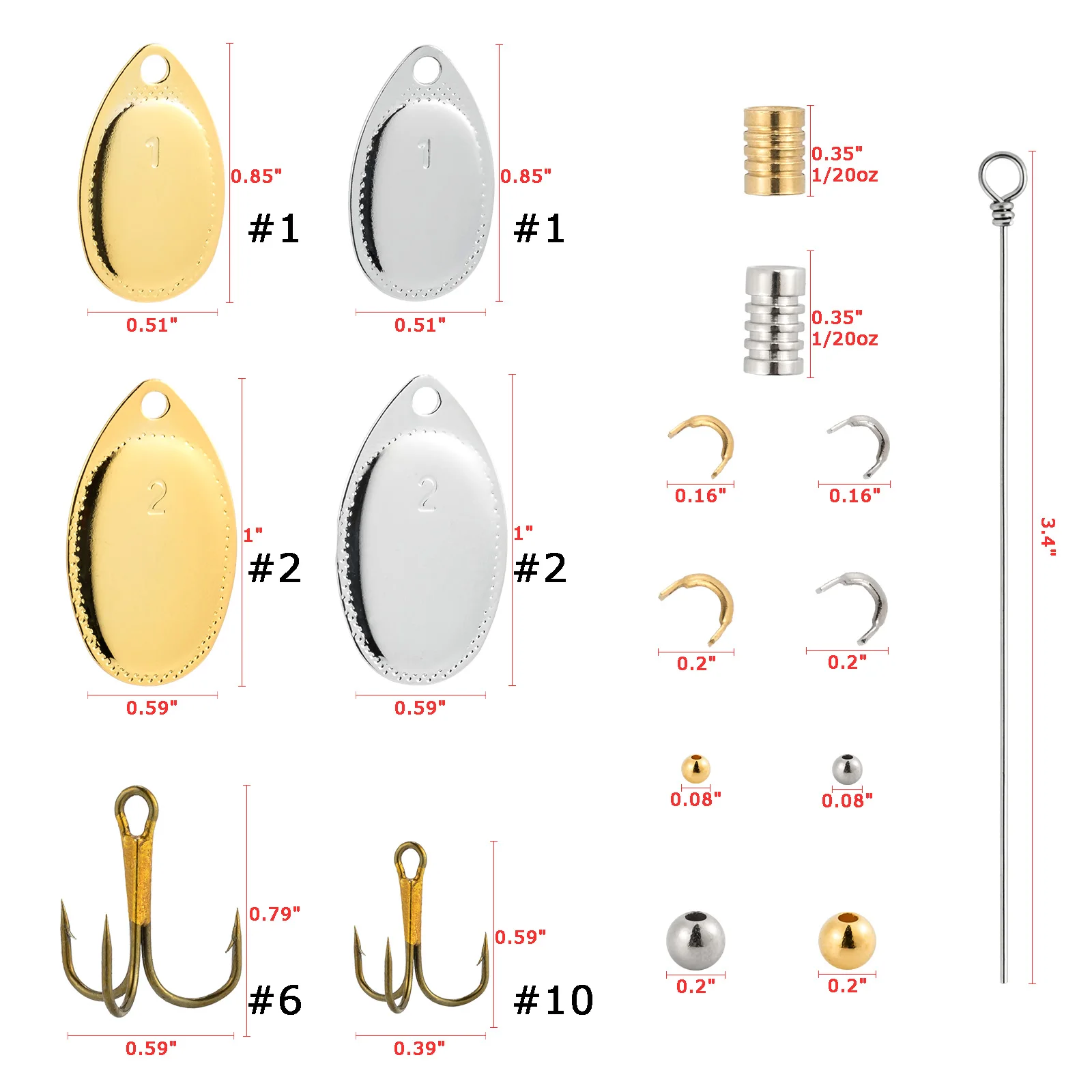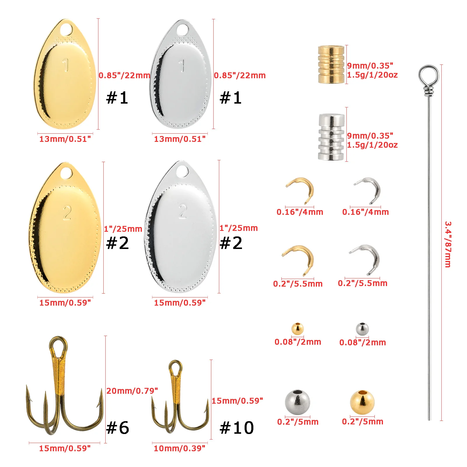 【Cantidad】Este surtido contiene 20 ejes, 20 cuchillas, 20 horquillas, 20 cuerpos de señuelos, 20 anzuelos triples y 40 cuentas. Ver imagen para tamaños detallados. 140 piezas en total