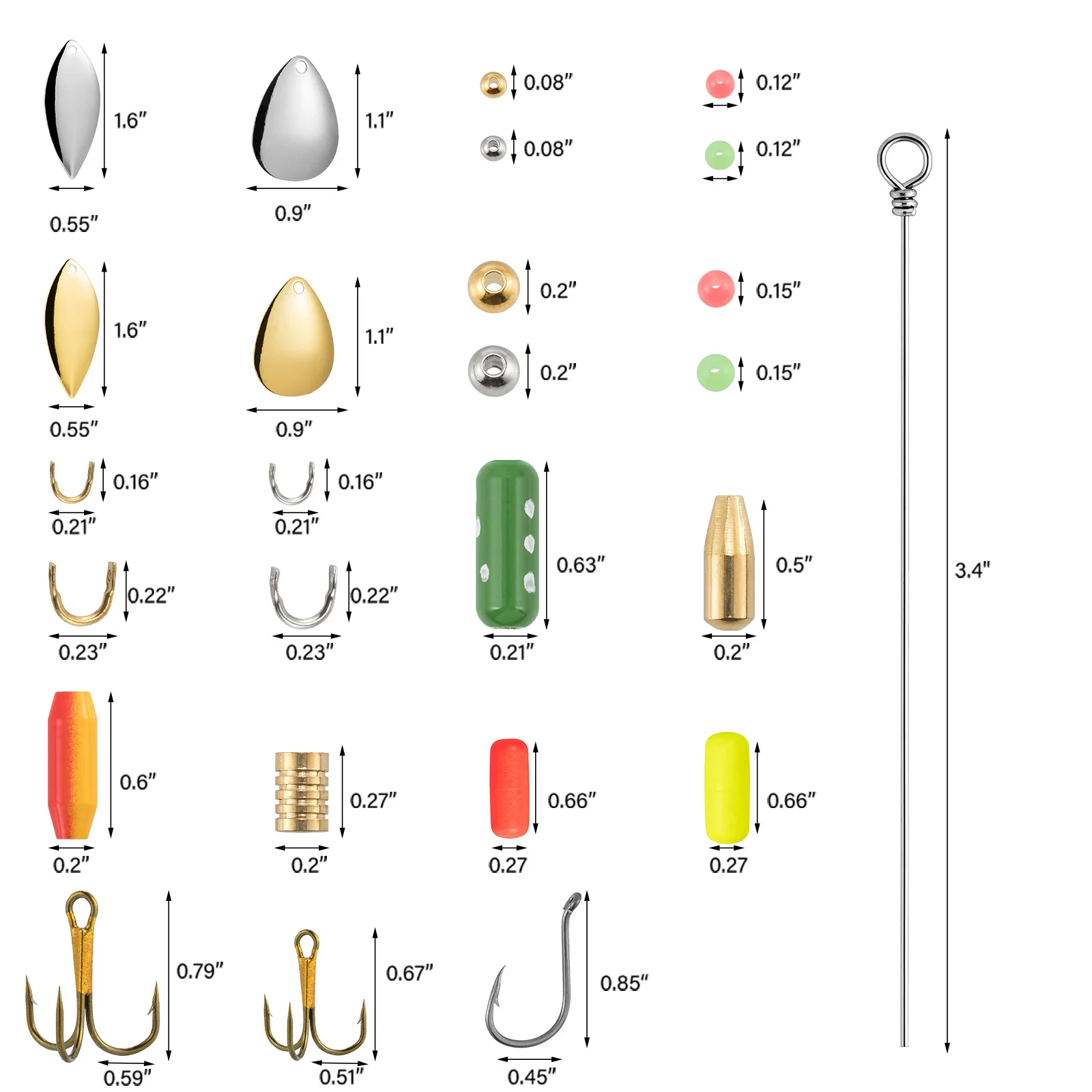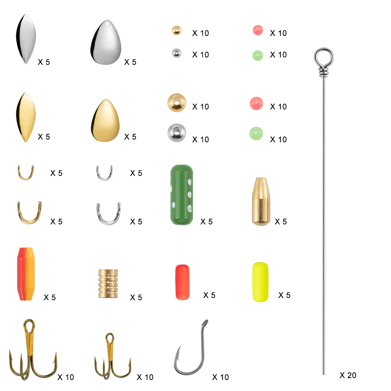 Cantidad:200 piezasConjunto todo en uno. Todos los componentes, excepto el alambre giratorio, vienen en dos tamaños para satisfacer sus diferentes necesidades de pesca.