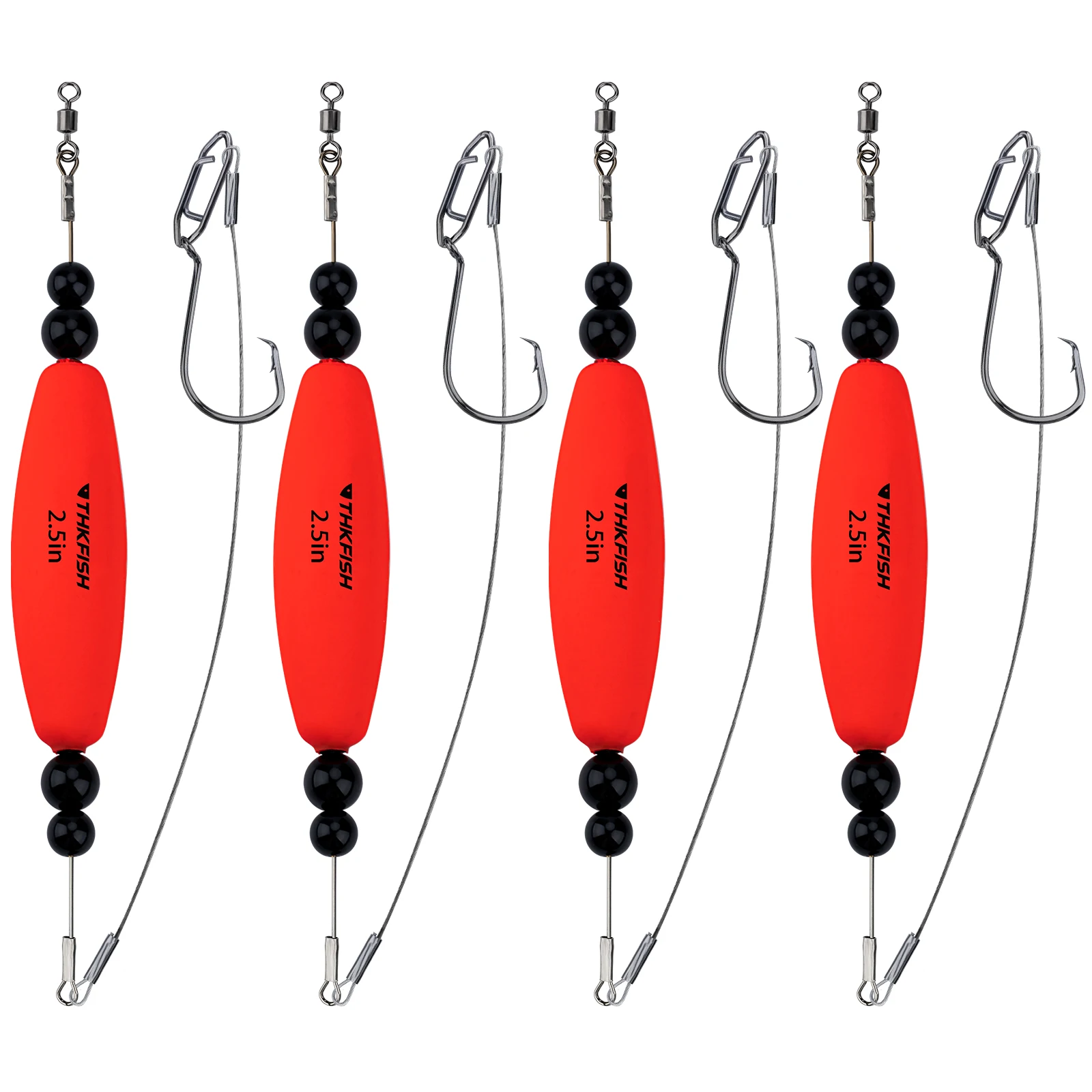 3.Rigs for Fishing Big Fish: The pre-rigged high carbon steel catfish circle hook with higher hardness, thicker and stronger tension than the ordinary hook. Work with big snap and premium soft steel wire, the rattling catfish float rig is capable of withstanding up to 65lb of pulling force. Flexible swivel connection design preventing the current or action of catfish rigs from twisting the main line.
