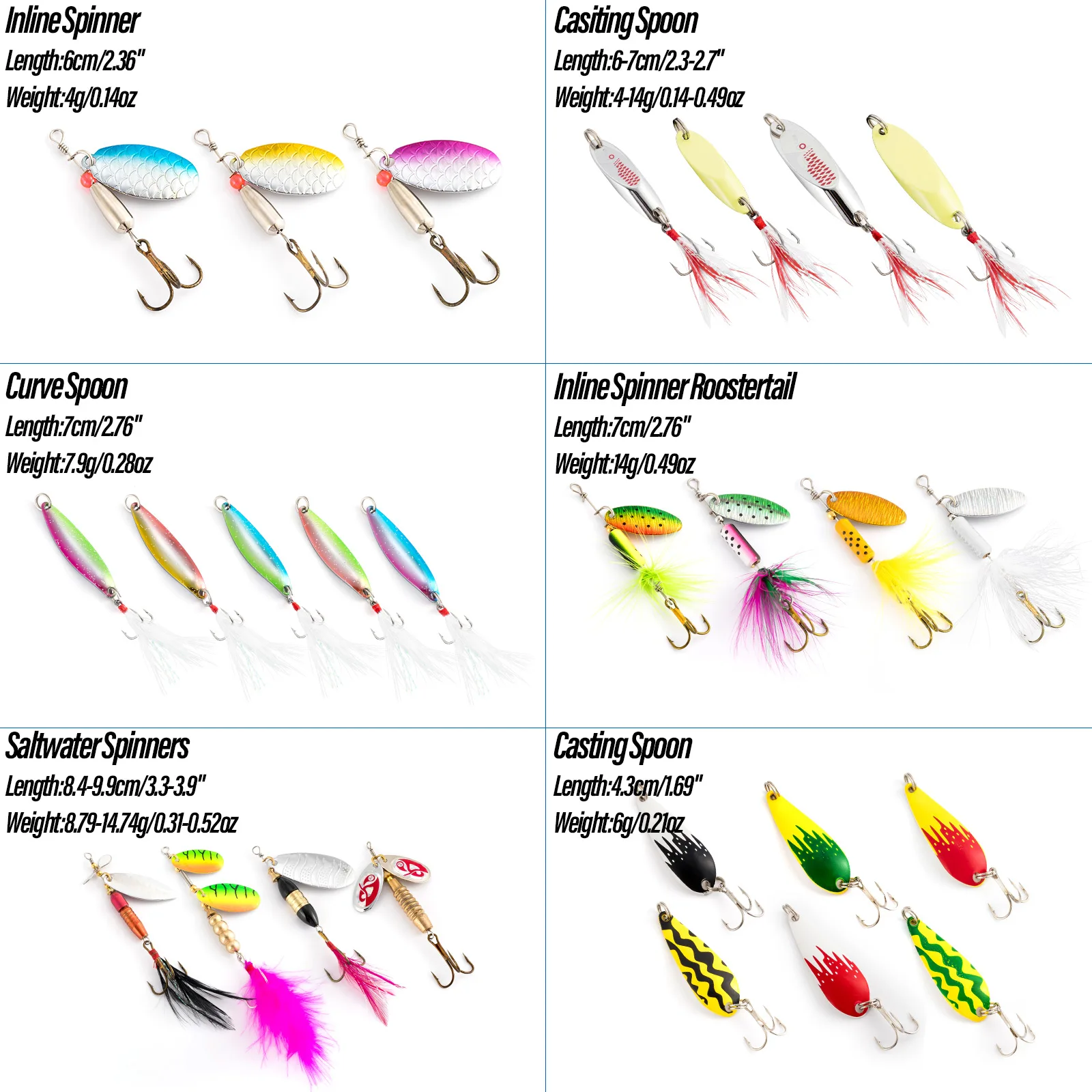 Ideal para agua dulce y salada: Los hilanderos de agua salada son de 0,3-0,5 oz. Otros Spinners y señuelos de peso van desde 0,14-0,5 oz. Por caja de señuelos, tamaño: 3,8x2,9x0,83 pulgadas