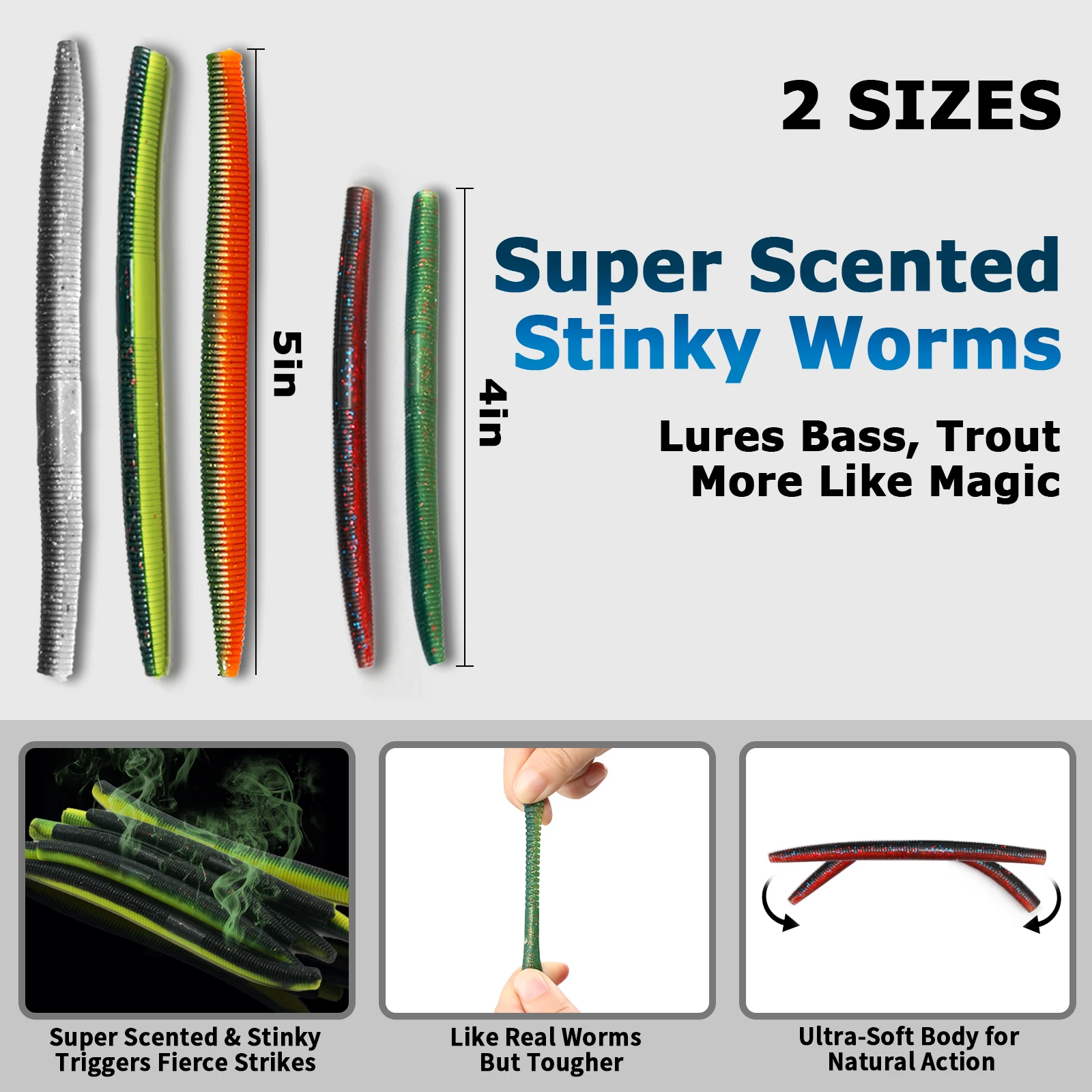 Hecho de plástico ultrasuave con acción oscilante natural para imitar presas reales.El diseño estilo Senko atrae lubina, trucha y panfish.También le proporcionamos señuelos de gusano de 4 y 5 pulgadas, para que pueda satisfacer sus diferentes necesidades de pesca con una sola compra.