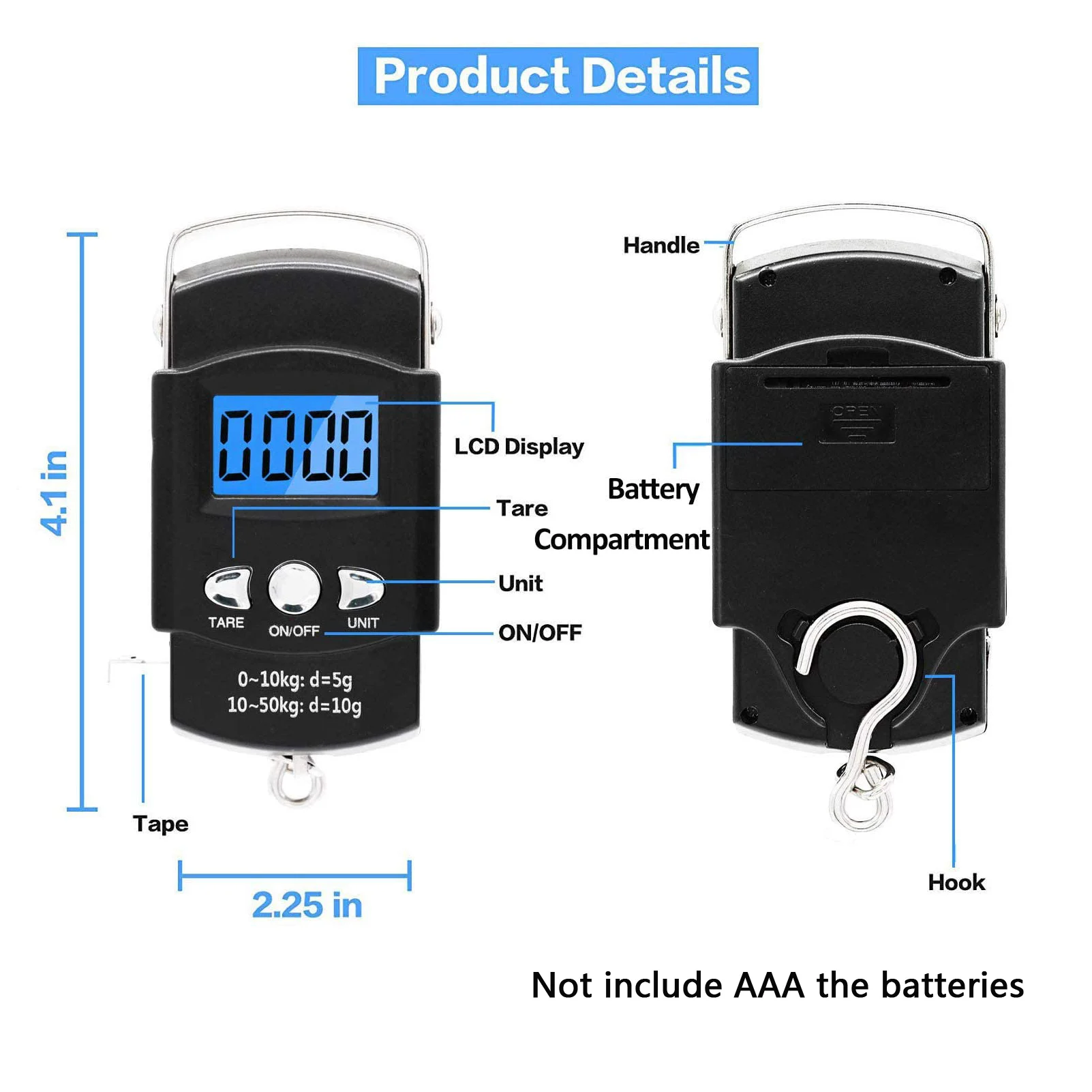 【 Herramienta on-the-Go 】Esta báscula de pesca puede pesar tanto las capturas pequeñas como las grandes, ¡Desde solo 0,2 libras hasta 110 libras! El Sensor de peso de última generación proporciona mediciones precisas (dentro de 5g) y puede convertir de lb. A oz. o kg. La cinta métrica incluida es ideal para medir artículos en cm o pies. (hasta 3 pies). No Incluye 2 pilas AAA.