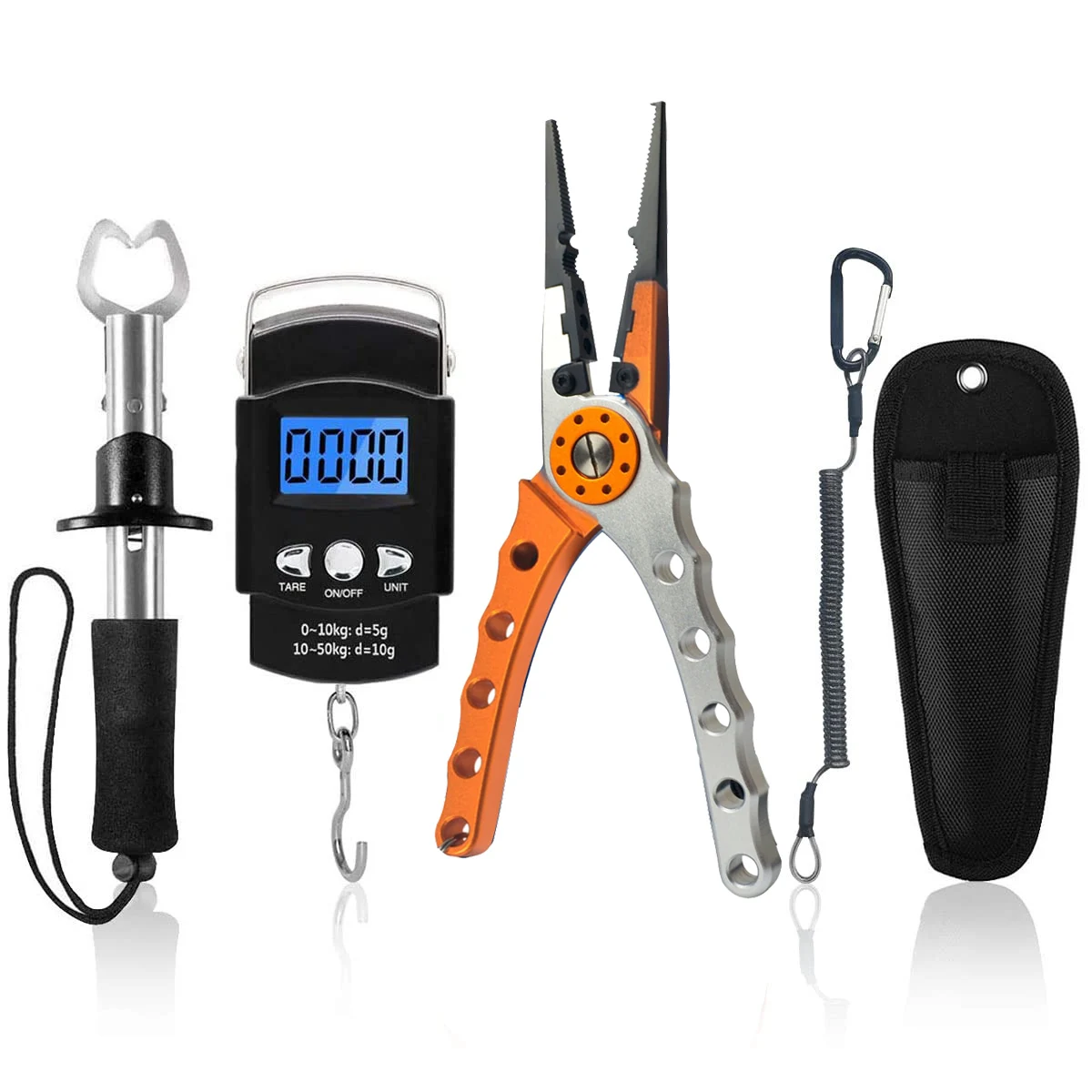 【Haz que el pescado sea más fácil】 Juego de herramientas de pesca perfectas: Alicates de pesca multifunción * 1 + pinza de pescado + báscula de pesca. Todas las herramientas que los pescadores deben tener. Alicates utilizados para cortar líneas de pesca, quitar anzuelos, anillo dividido, ajustar los accesorios de pesca y el kit. Agarre de labios de pescado utilizado para sostener un pez y proteger sus dedos.