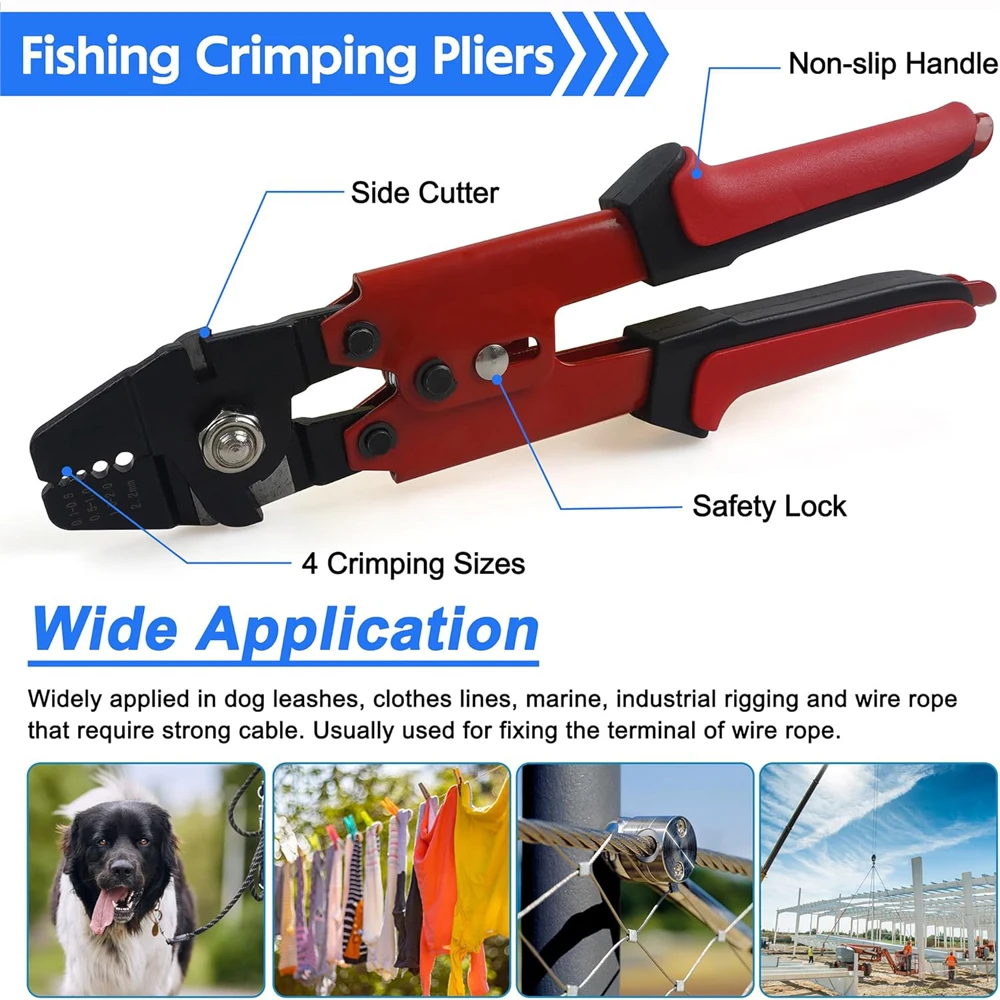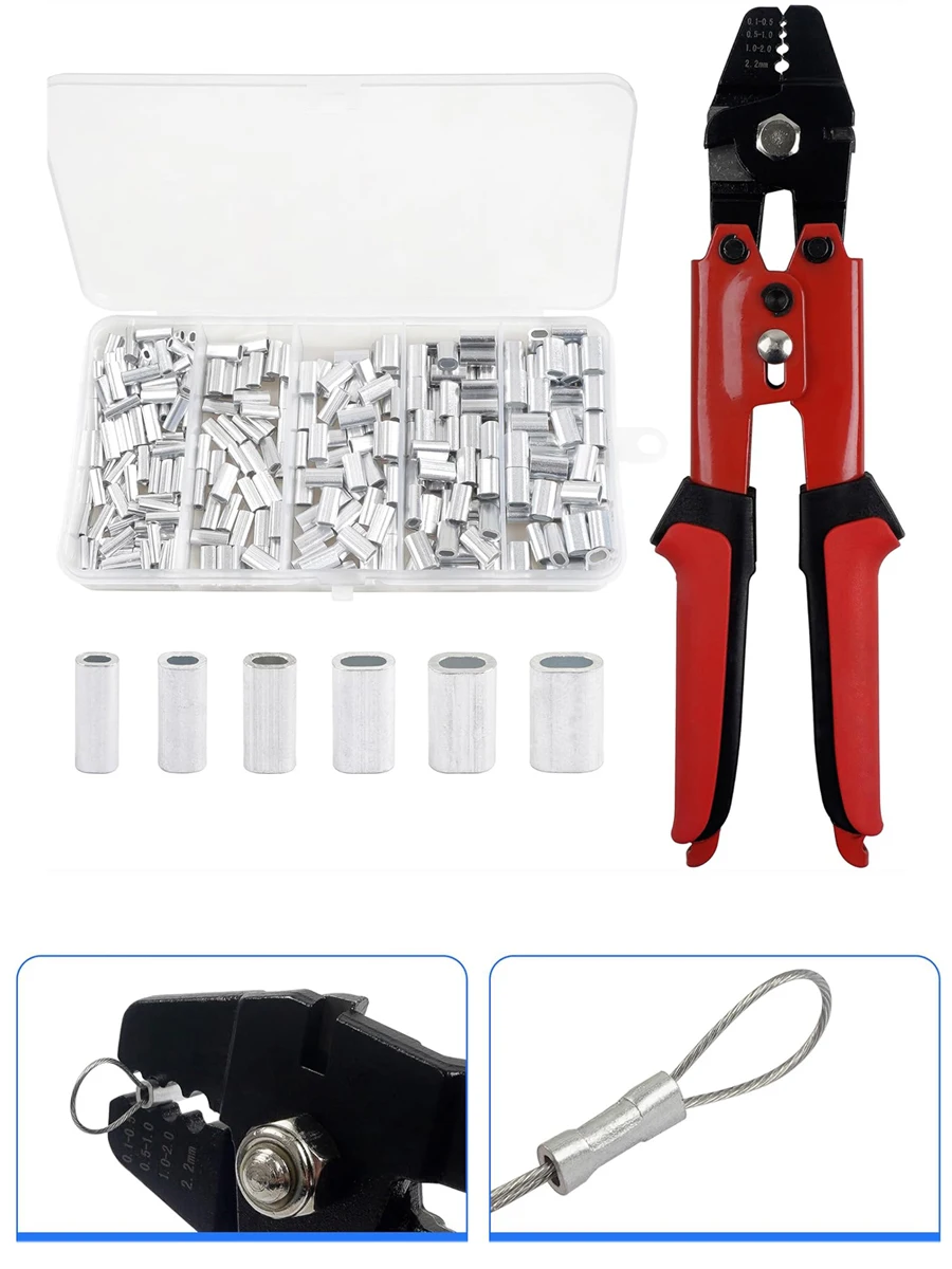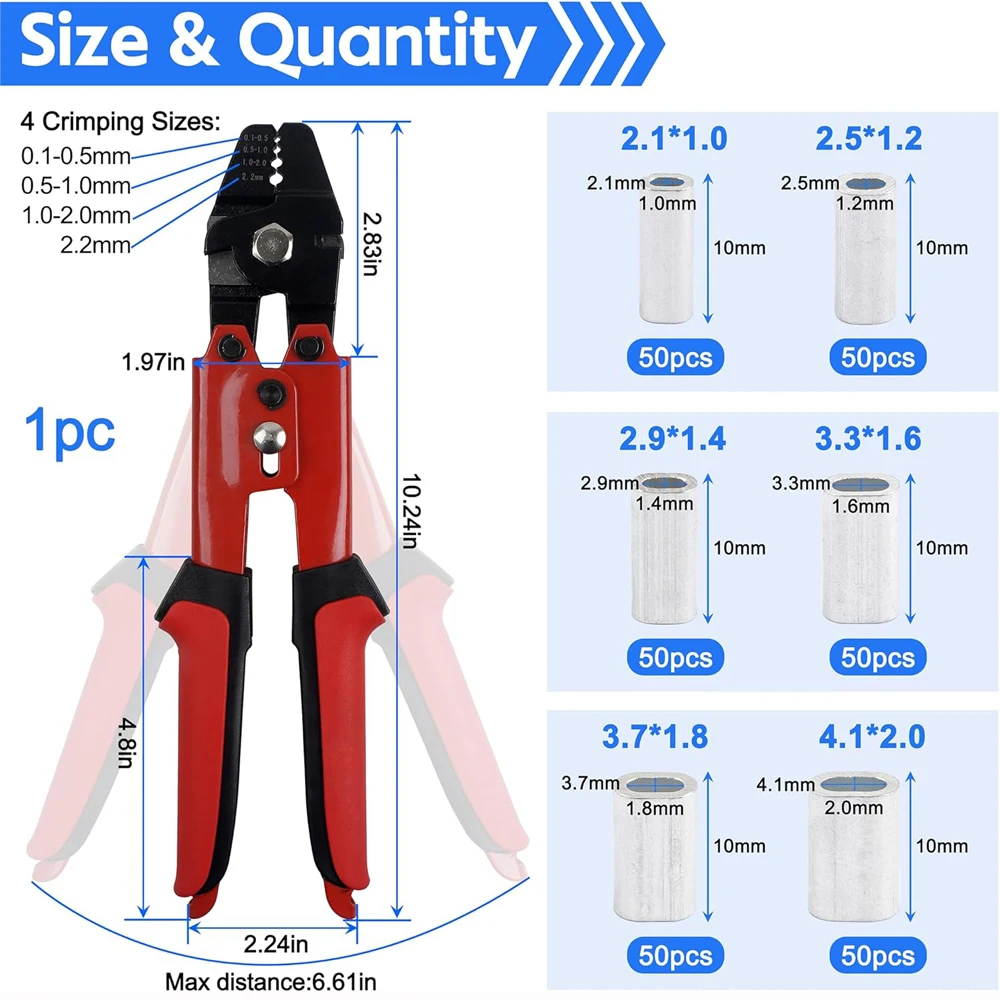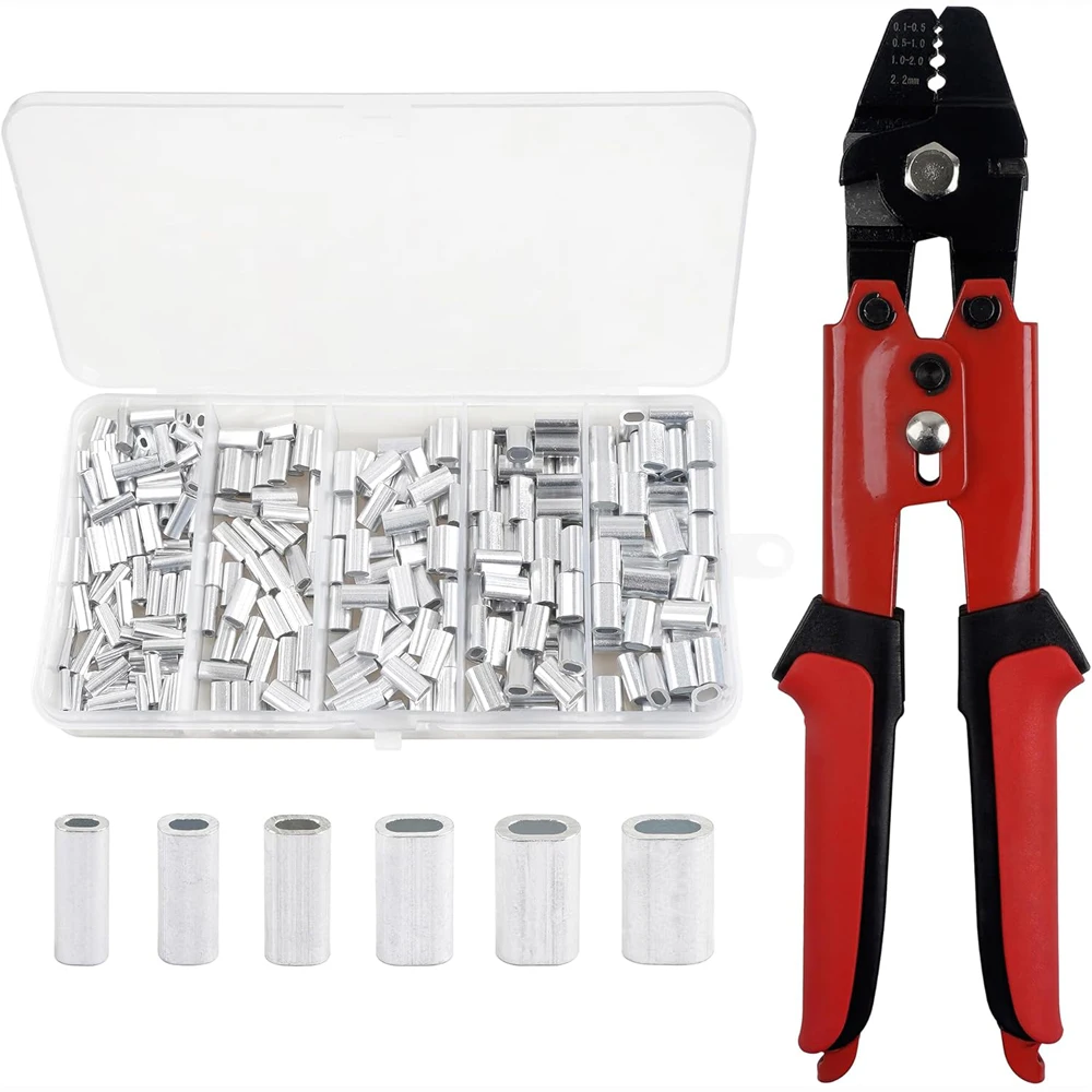 1. Alicates de engarce de pesca de acero inoxidable de 1 piezas + 1 caja de juego de manguitos de engarce dobles de 300 piezas (5 tamaños combinados), varios tamaños pueden satisfacer sus diferentes necesidades.