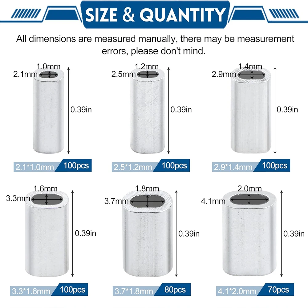 1. 550 unids/caja Kit de mangas engarzadas recoge 6 tamaños consistentes para satisfacer sus diversas necesidades de pesca. 100mm 2,1*1,0mm, 100mm 2,5*1,2mm 100*2,9mm 1,4*100mm 3,3*1,6mm 3,7*1,8mm * mm, 70, 4,1x2,0mm.