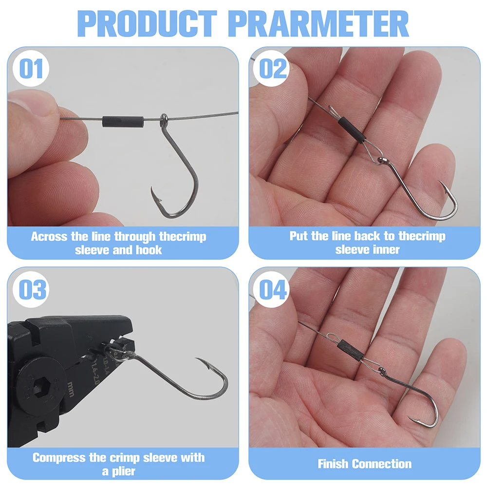 FÁCIL DE USAR: simplemente Inserte el alambre o la guía de pesca en una sola manga de engarce, asegúrese de que la línea esté completamente insertada y apriétela con sus alicates u otra herramienta de compresión para crear una conexión firme y segura.