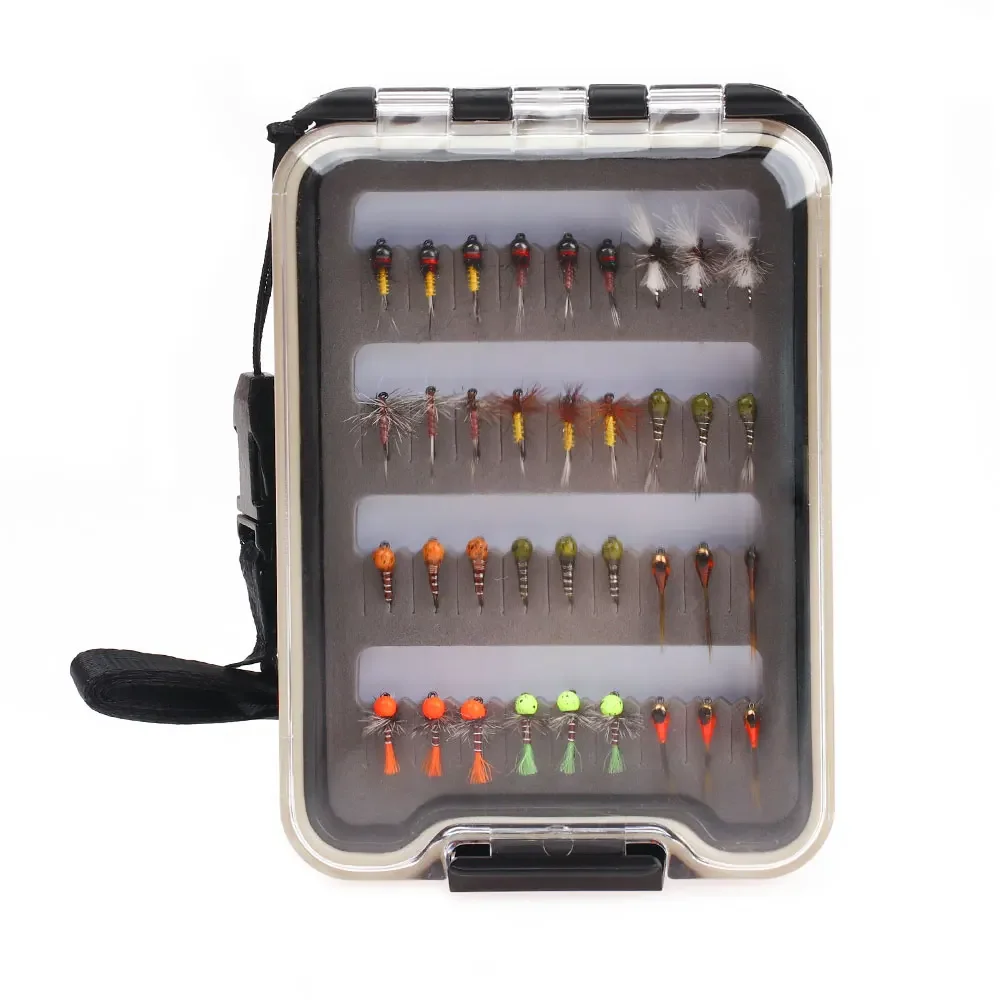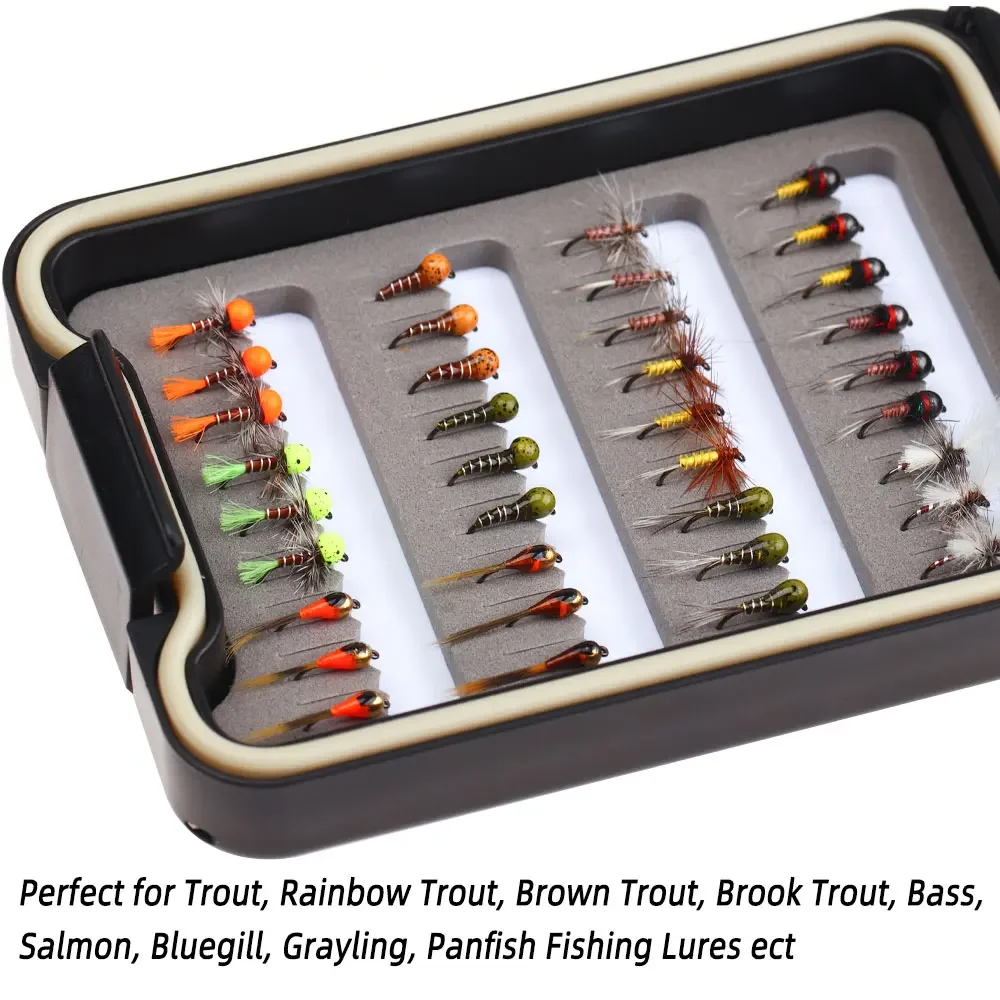 [Patrones seleccionados superiores] - 36 piezas, 9 patrones de ninfas variadas y moscas secas, colores brillantes, tamaño de 18 ~ 20, satisfacen sus diferentes necesidades.Hay 2 estilos de moscas secas, lo que permite al pescador pescar la comida directamente en el agua superior, y el estilo equilibrado es una cabeza de cuentas de latón y una cabeza de cuentas de tungsteno desplazada, lo que permite al pescador pescar la mosca directamente en el fondo donde viven..