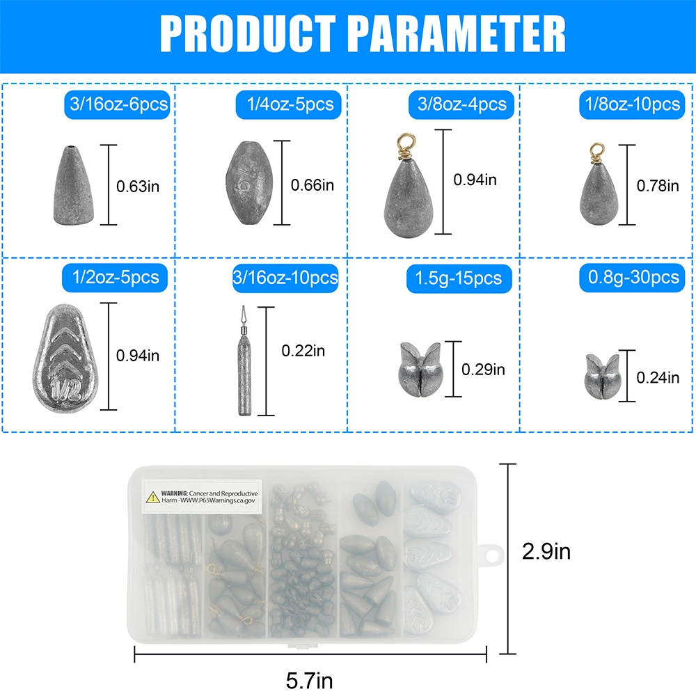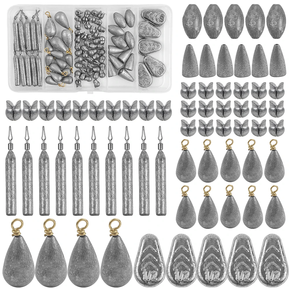 El paquete incluye: Kit de pesas de plomada de pesca surtidas en un total de 85 piezas, disponible en 6 tipos de plomadas, ampliamente utilizado para aparejos de Texas, aparejos de Carolina y aparejo de Bobber deslizante, etc.