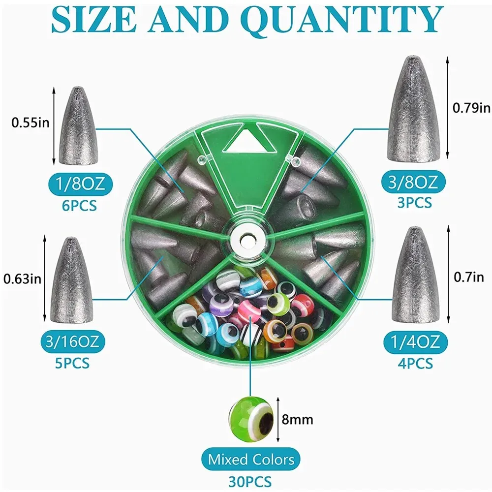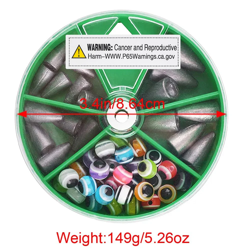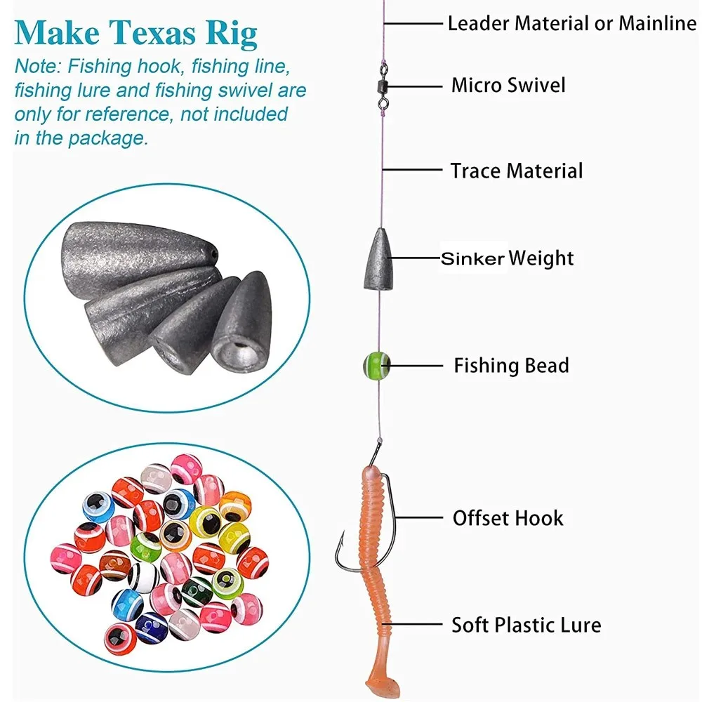 KIT DE RIG EFICAZ: El juego de plomos y cuentas de pesca se puede utilizar para hacer Texas Rig y Slip Bobber Rig. Estos aparejos de pesca son fáciles de configurar y rápidos de usar, aumentan las posibilidades de atrapar lubinas grandes.