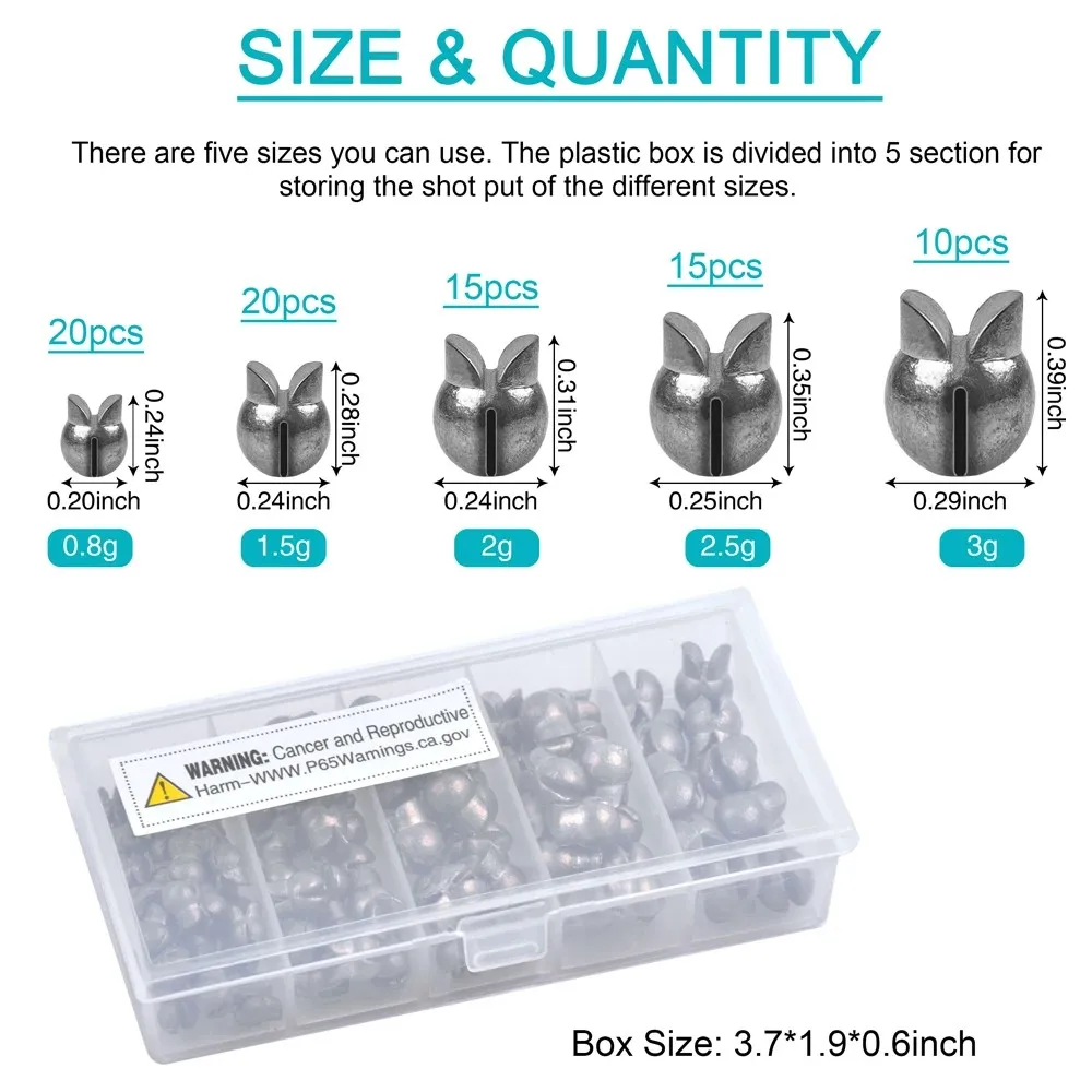 80 plomos de pesca en una caja.