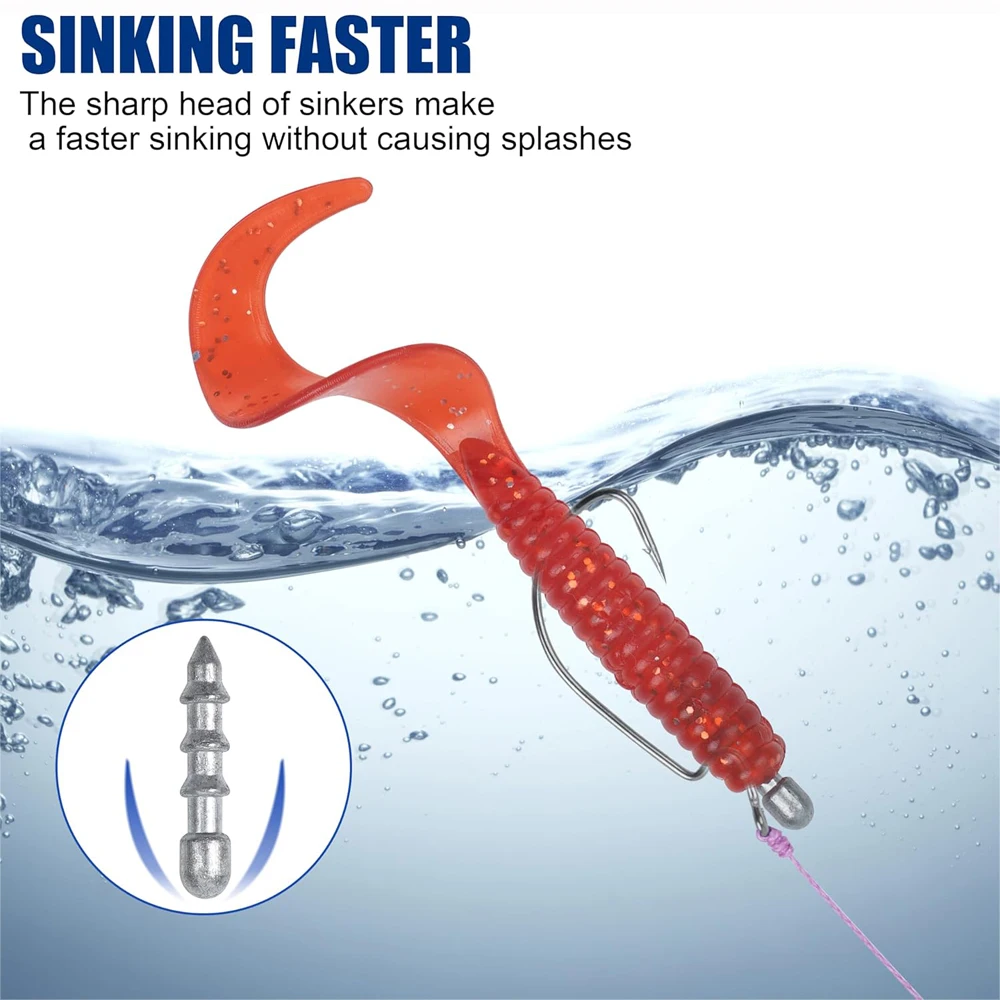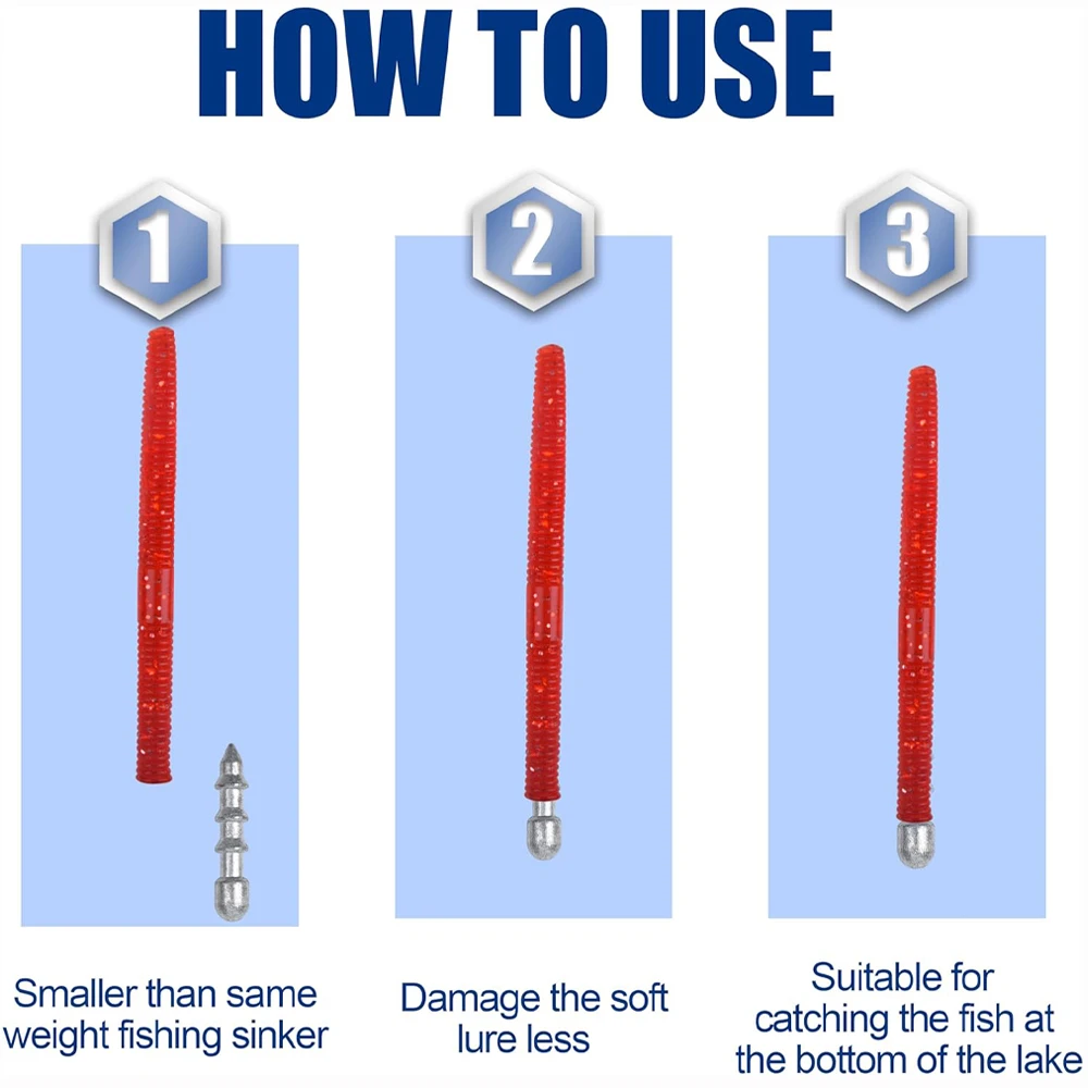 1. Las pesas de gusano loco están hechas de material de alta calidad con superficie lisa y resistente a la corrosión. Puede insertarlos y quitarlos fácilmente a mano de sus cebos de plástico blando.