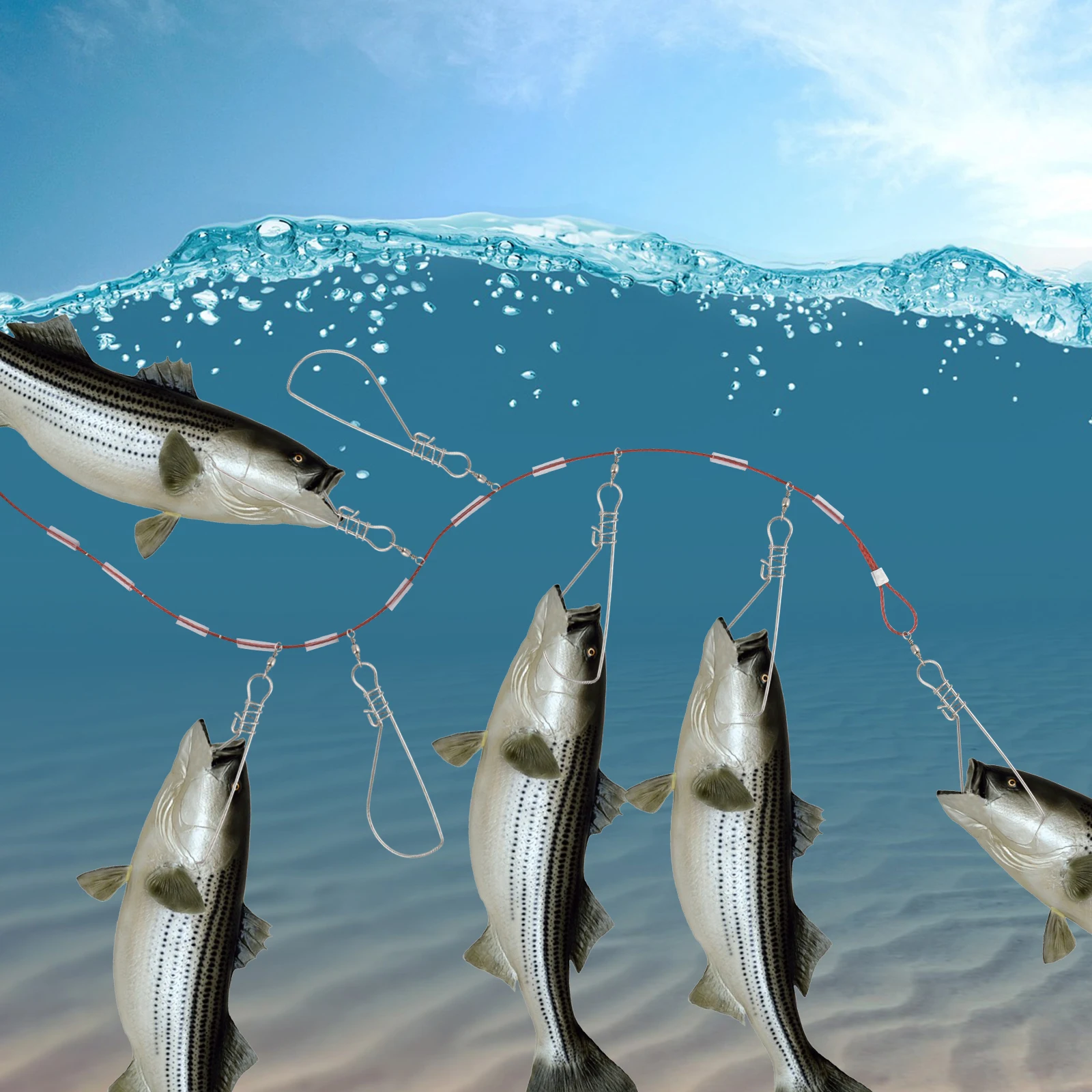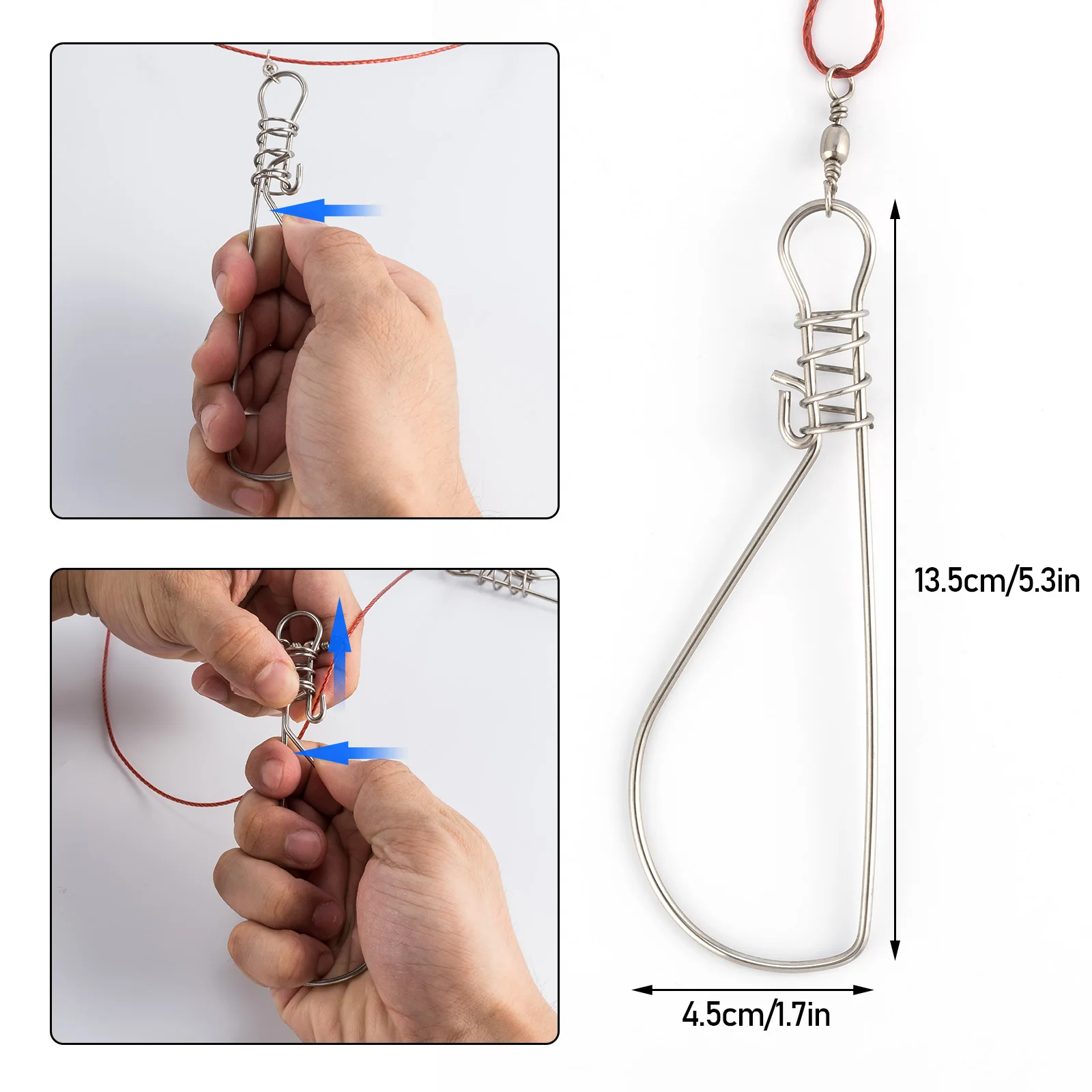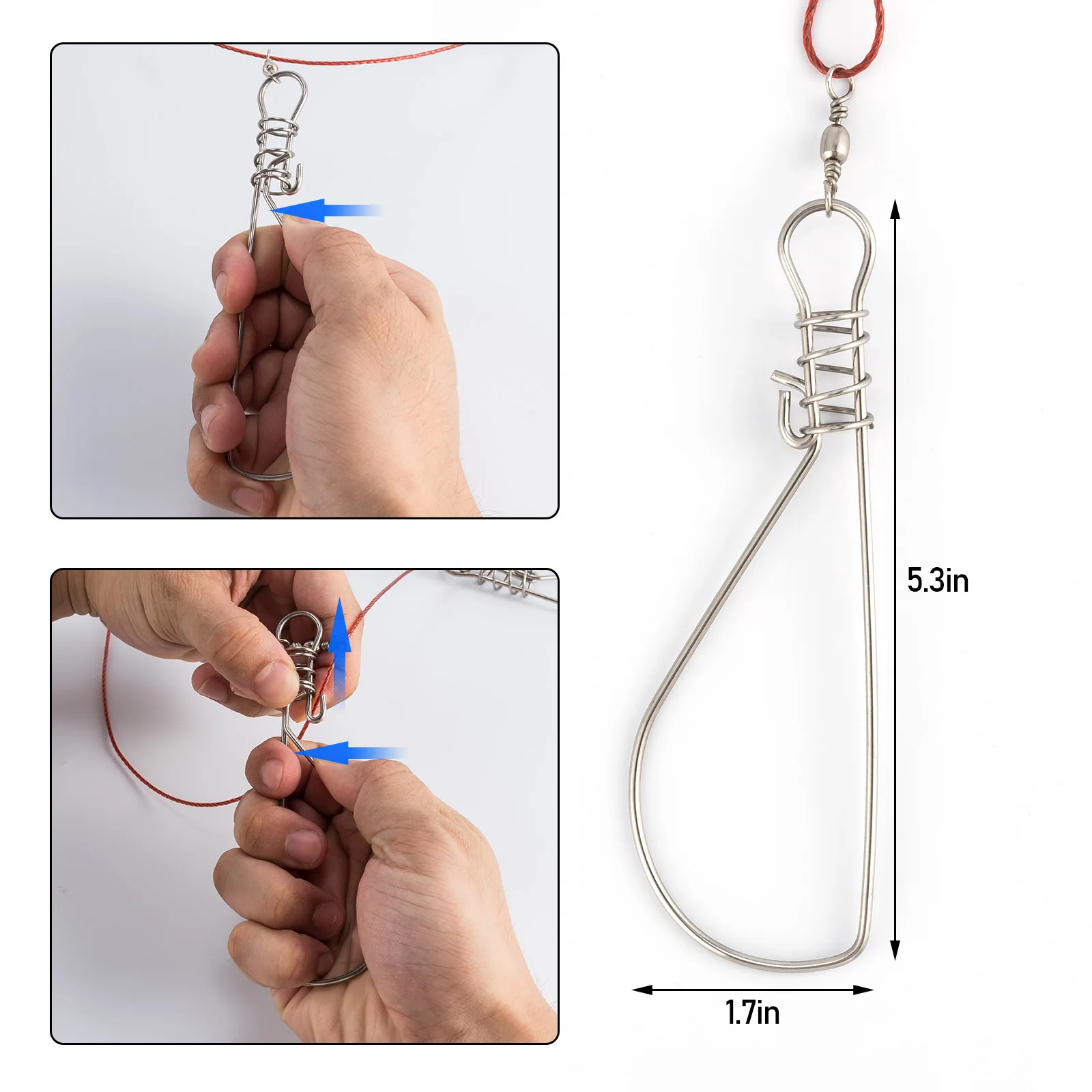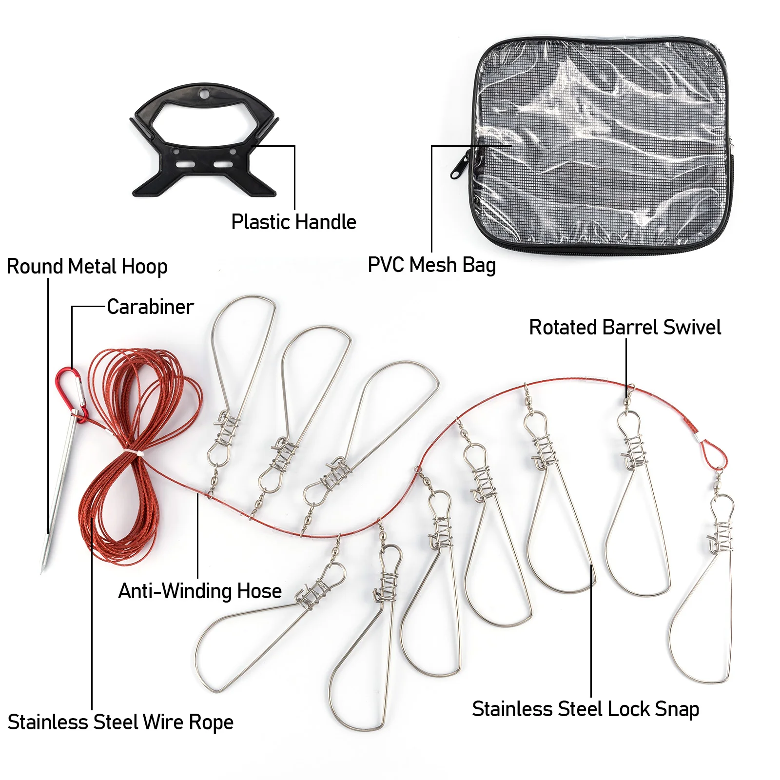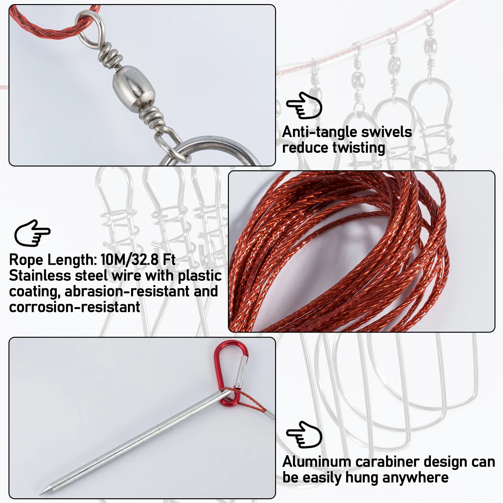 4. Usar largueros será una forma más simple y efectiva de manejar cualquier pez que capture mientras pesca. Cuerda de acero inoxidable recubierta de plástico con 10 broches de acero inoxidable para una larga duración contra el agua salada. Cuerda de alambre de 10M/32,8 pies de longitud lo suficientemente larga como para atar todo el pescado fresco.