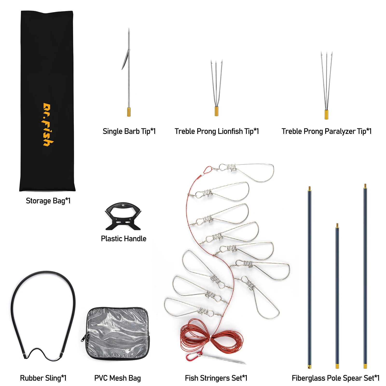 1 、 Caña de pesca submarina Dr. Fish hecha de fibra de vidrio, resistente, duradera y cómoda de agarrar. Viene con una eslinga de goma, que puede disparar rápidamente la pistola de lanza de peces y atrapar los peces con mayor comodidad.