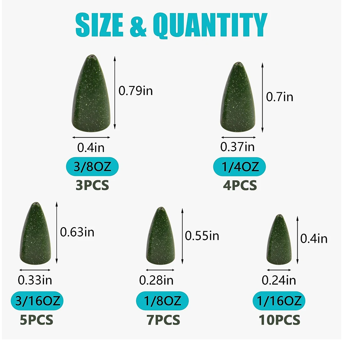 Tamaño del peso de pesca: 1/16OZ, 1/8OZ, 3/16OZ, 1/4OZ, 3/8OZ