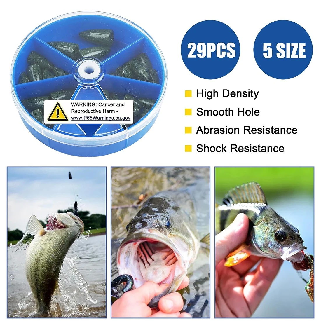 2. Los pesos de pesca de bala tienen alta densidad, la superficie lisa y pulida bajo el agua reduce la fricción, minimizando así el efecto en la acción de natación de su señuelo. El agujero redondo sin rebabas, es fácil de pasar a través de la línea.