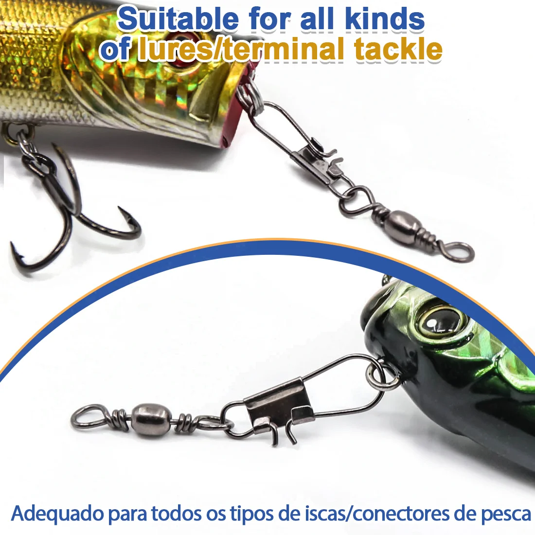 Cambio rápido: el giro a presión del barril con bloqueo y apertura rápida le permite cambiar los líderes de pesca o los señuelos de pesca en segundos. El broche giratorio funciona muy bien para diversos aparejos y marcas líderes.