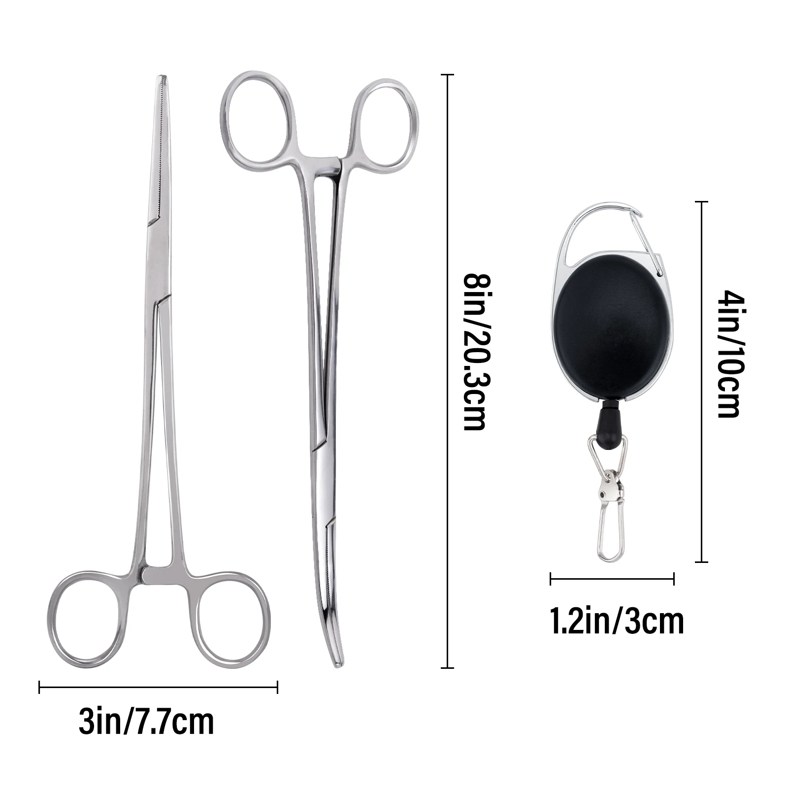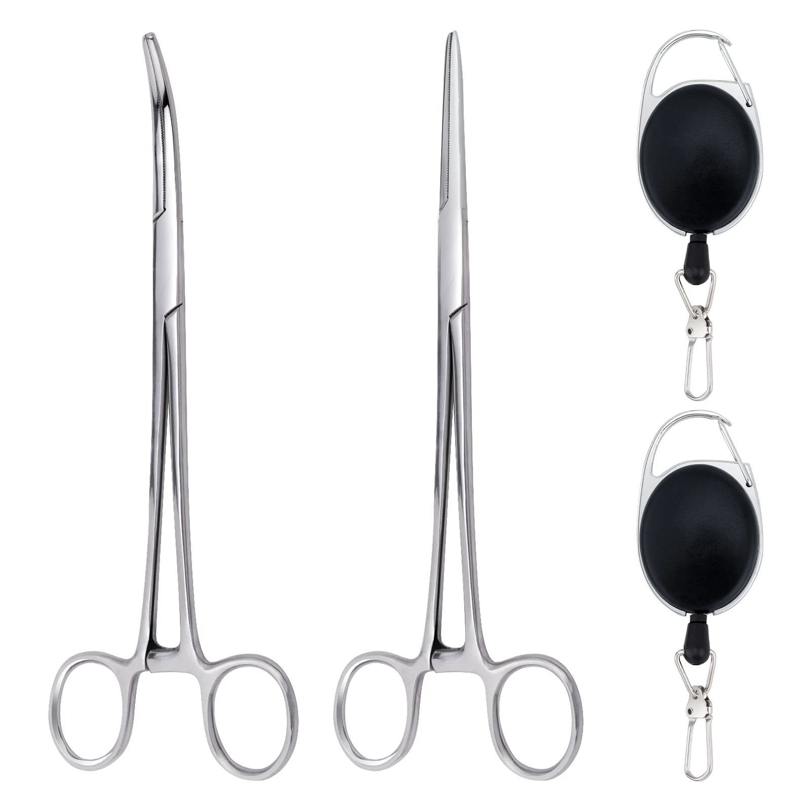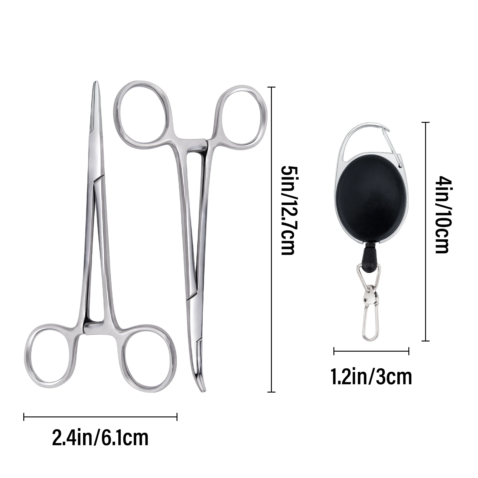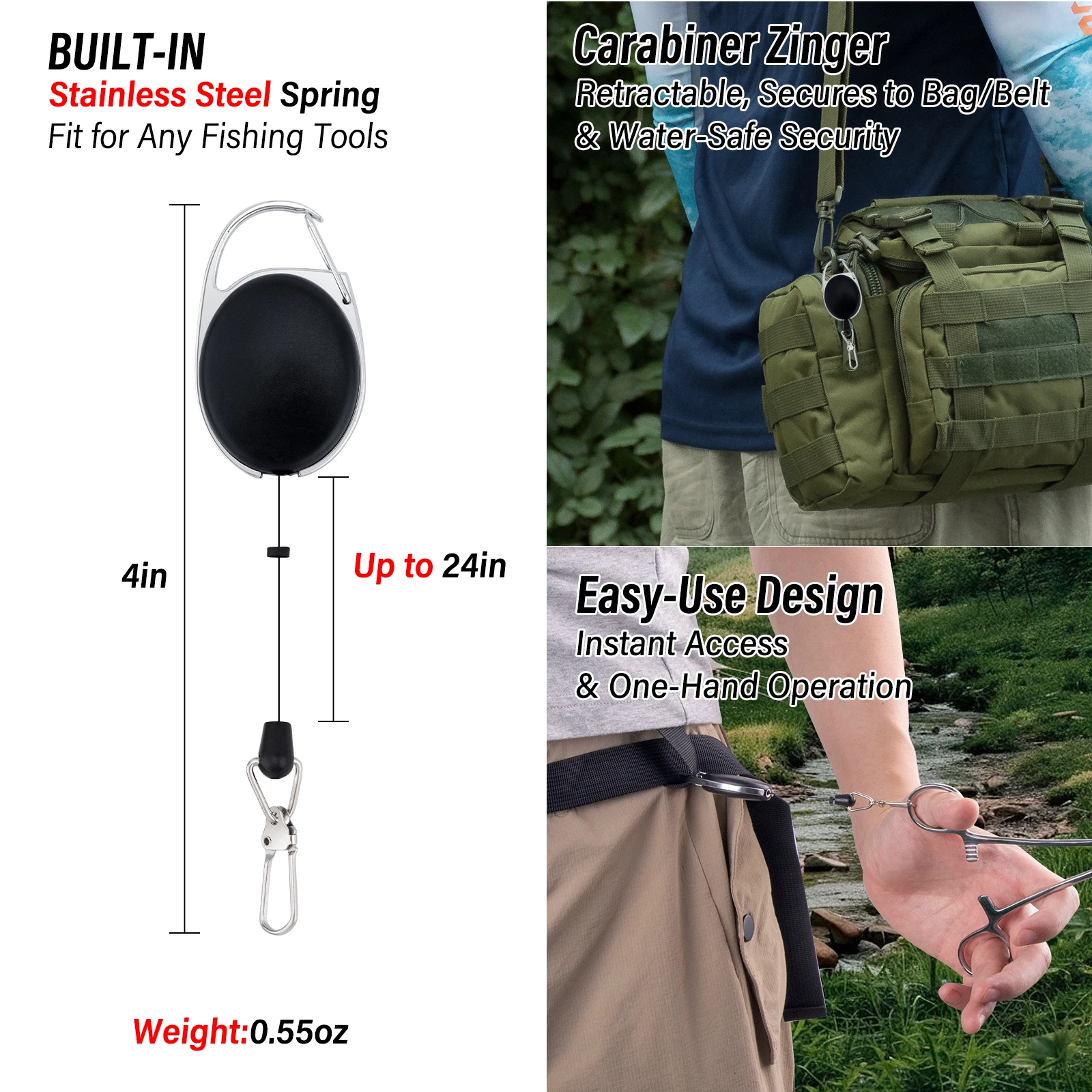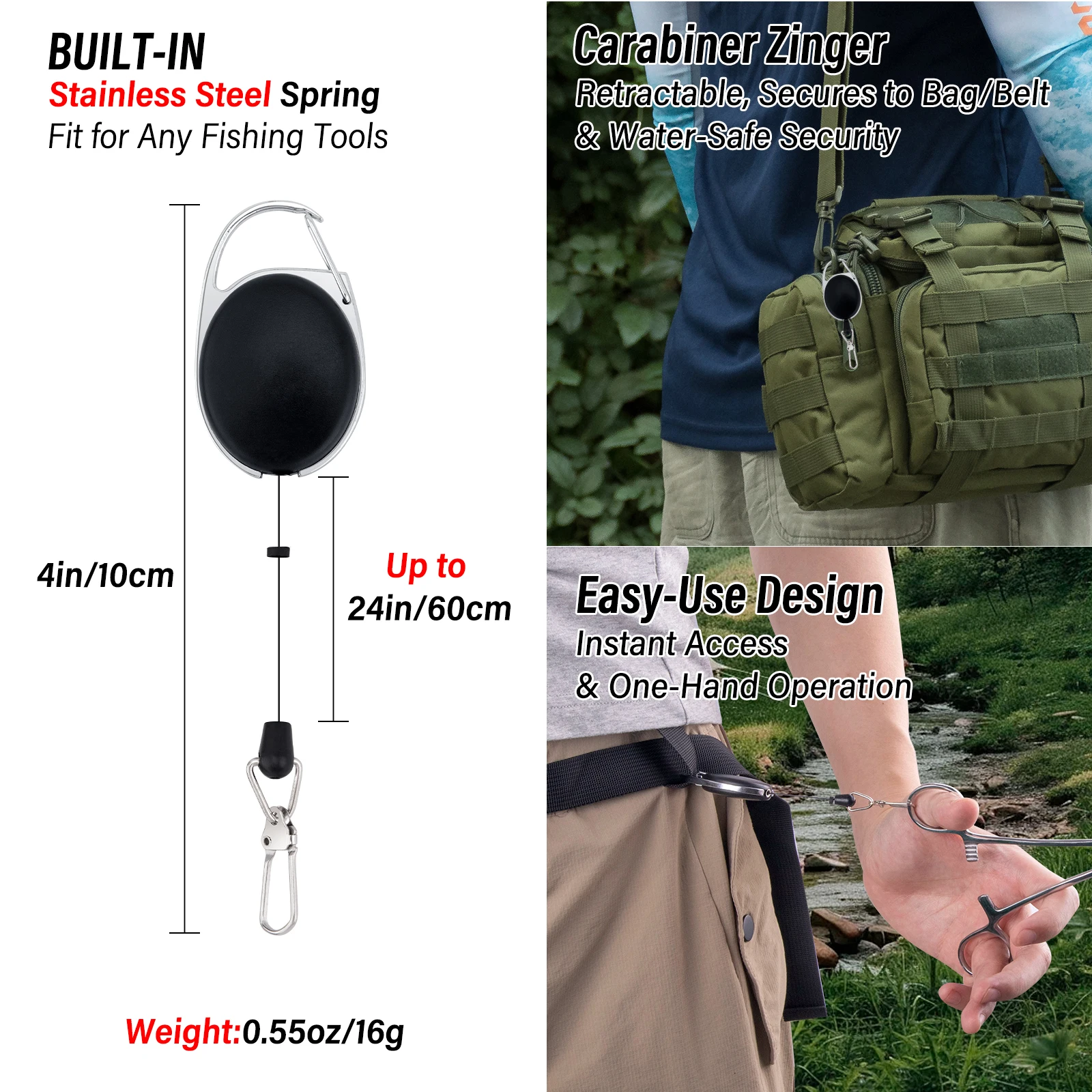 Sistema de cordón retráctil: cada pinza de pesca Dr.Fish se combina con un retractor de resorte de acero inoxidable para un acceso instantáneo con una sola mano.El mosquetón Zinger resistente al agua se fija fácilmente a chalecos, bolsos o cinturones, manteniendo las herramientas al alcance de la mano y evitando pérdidas.