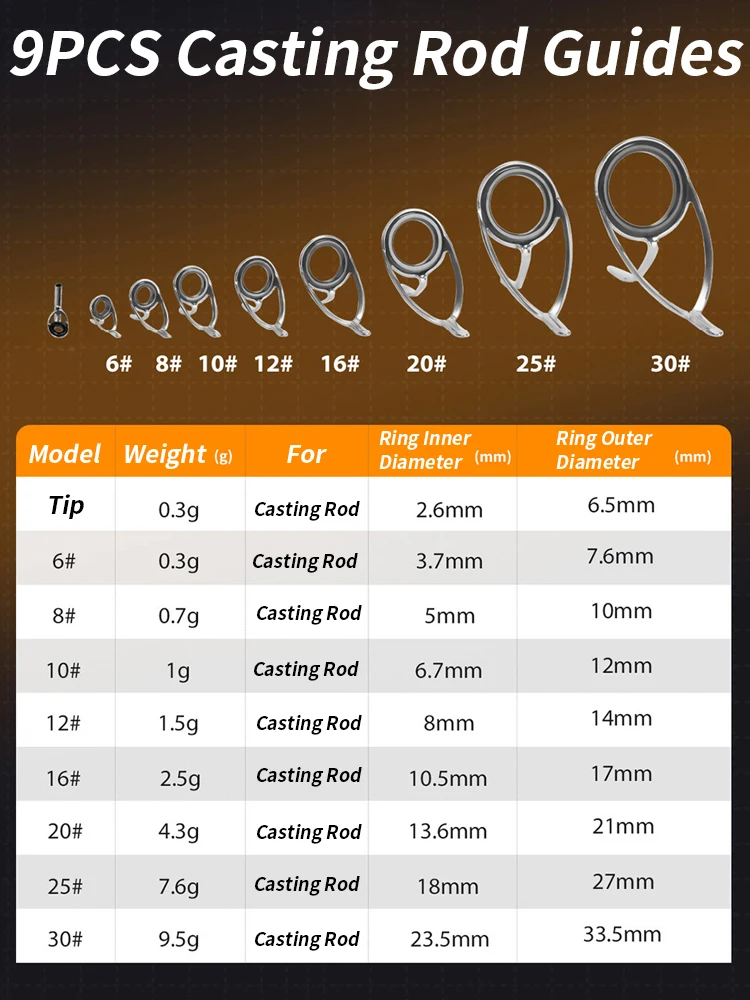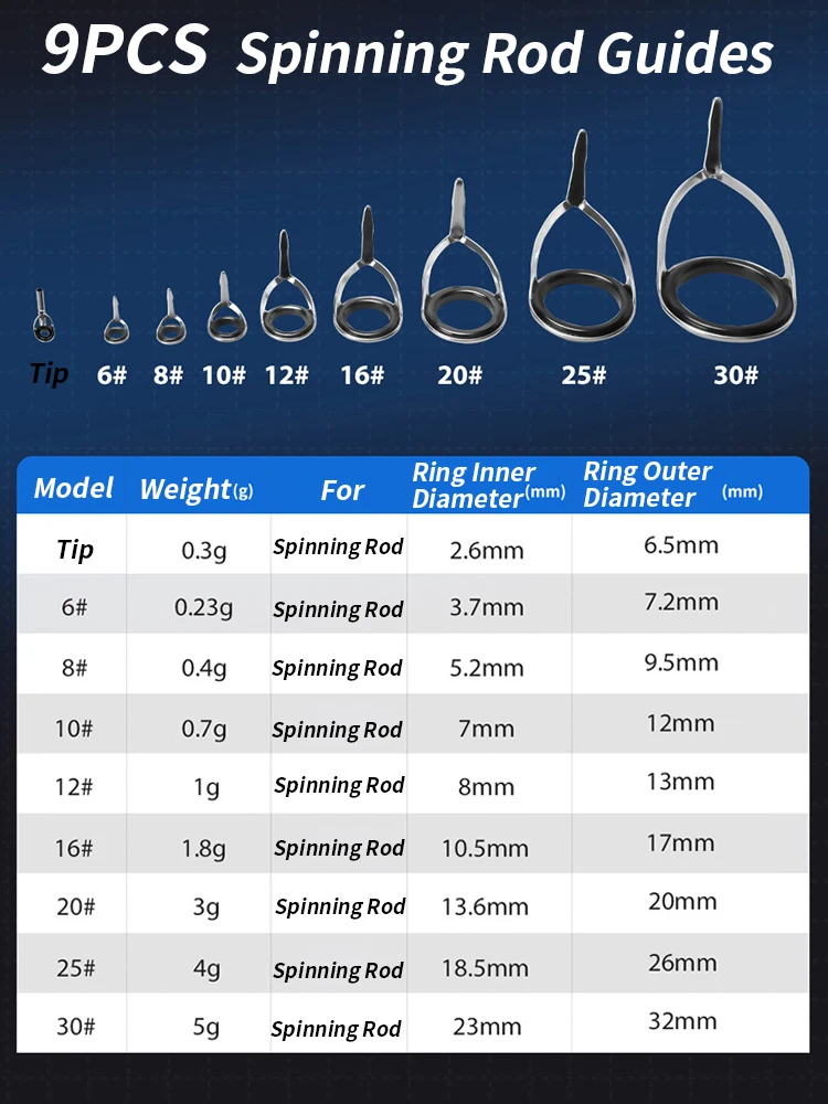 4. GUÍA DE VARILLAS DE CAÑAS DE PESCA DE VARIOS TAMAÑOS: Un total de 9 piezas en diferentes tamaños de anillos guías de caña. 1 punta + 8 guías tamaño 6 # ,8 # ,10 # ,12 # ,16 # ,20 # ,25 # ,30 # .