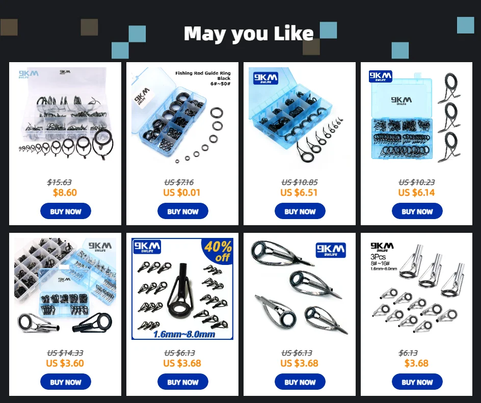 Kit de reparación de puntas de 9KM DWLife Rod Guides:Las puntas de las guías de las cañas de pescar están hechas de marco de acero inoxidable con anillo de cerámica, los ojales de 10 tamaños cumplen con los diversos tipos de cañas de pescar propiedad de pescadores profesionales. Tanto la pesca de agua dulce como la de agua salada/mar están disponibles.